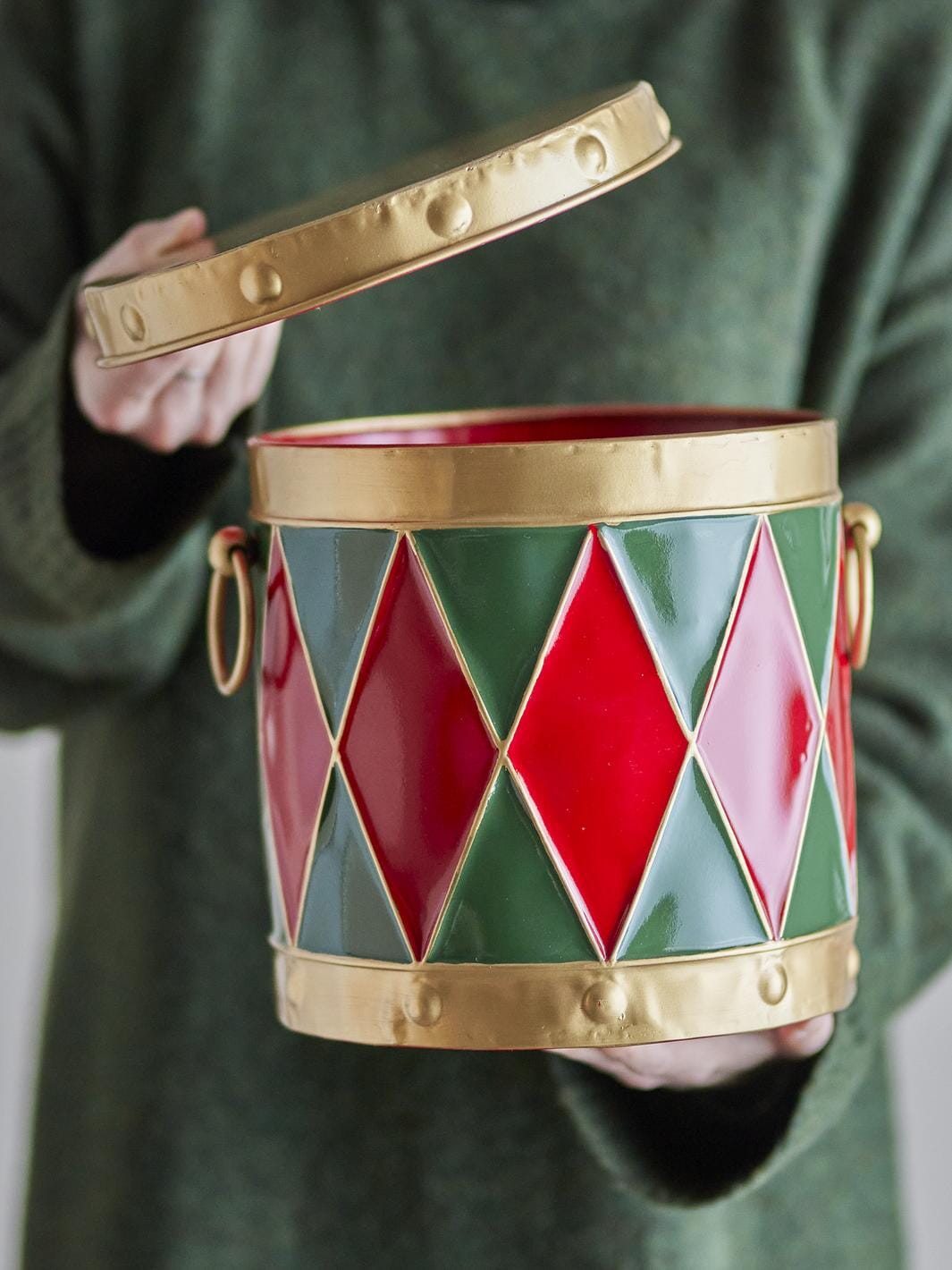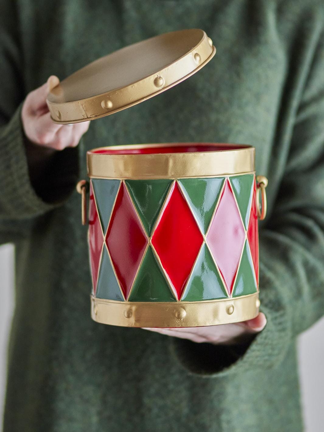 Metalowa puszka w kształcie bębna od Bloomingville z czerwonym i zielonym wzorem diamentowym oraz złotymi detalami. Zestaw składa się z dwóch pudełek z odpinanymi pokrywkami.