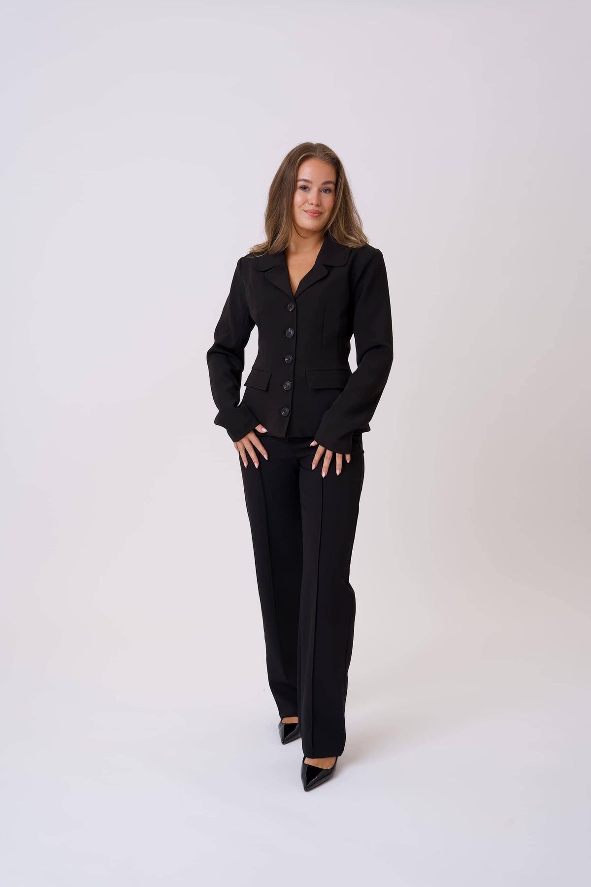 Czarna marynarka od BYIC o kroju slim fit. Marynarka ma klasyczny kołnierzyk, guziki w naturalnych kolorach i dwie kieszenie z klapami z przodu. Strukturalny materiał podkreśla talię.