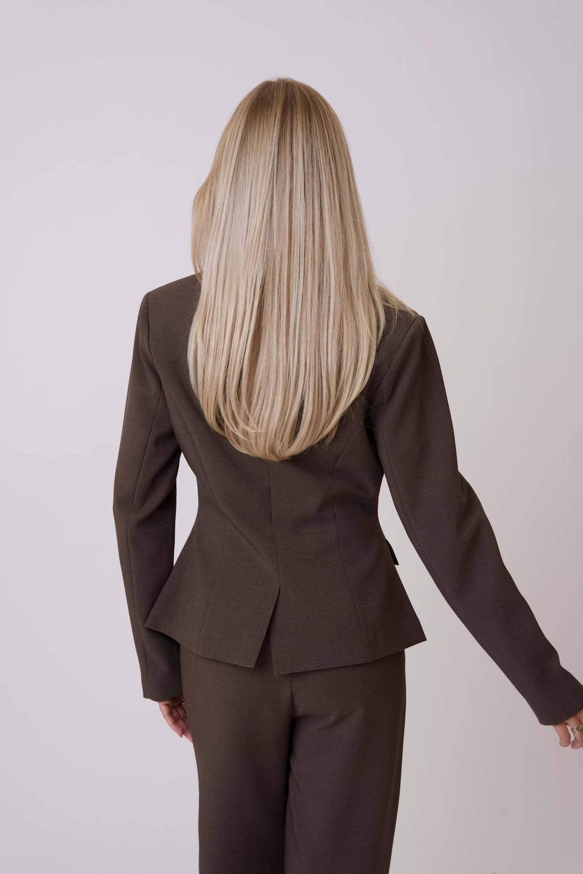 Ciemnobrązowy żakiet od BYIC o dopasowanym kroju. Żakiet ma klasyczny kołnierzyk, długie rękawy i pięć guzików w naturalnych odcieniach z przodu. Miękki, strukturalny materiał zapewnia dobrą wygodę.