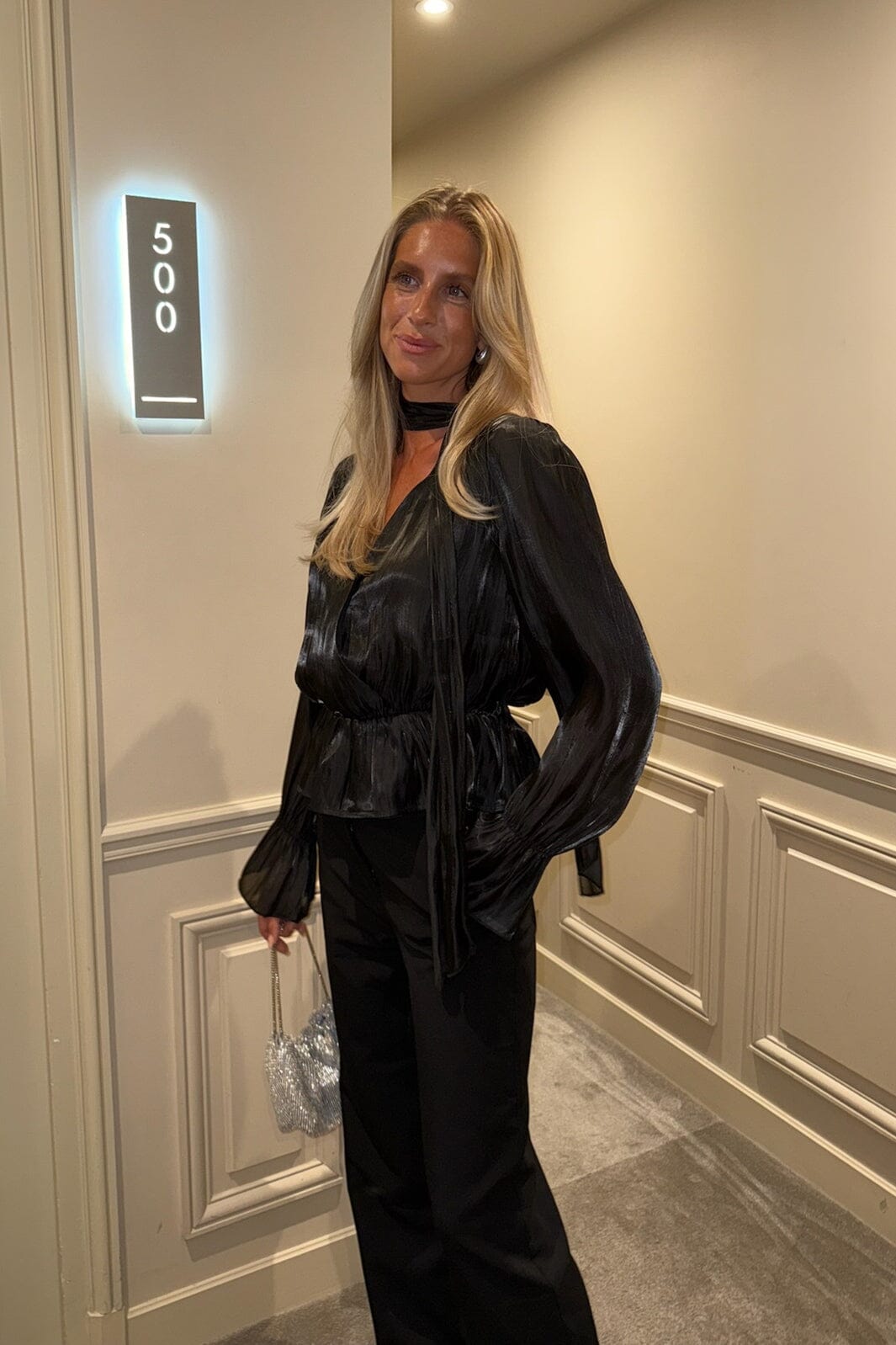 Czarna koszula od BYIC z błyszczącą powierzchnią. Koszula ma luźny krój z zaznaczoną talią i głębokim dekoltem w kształcie V z detalem kopertowym.