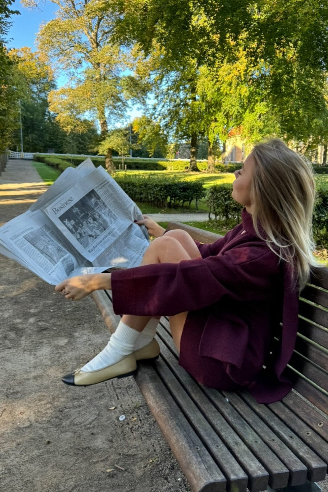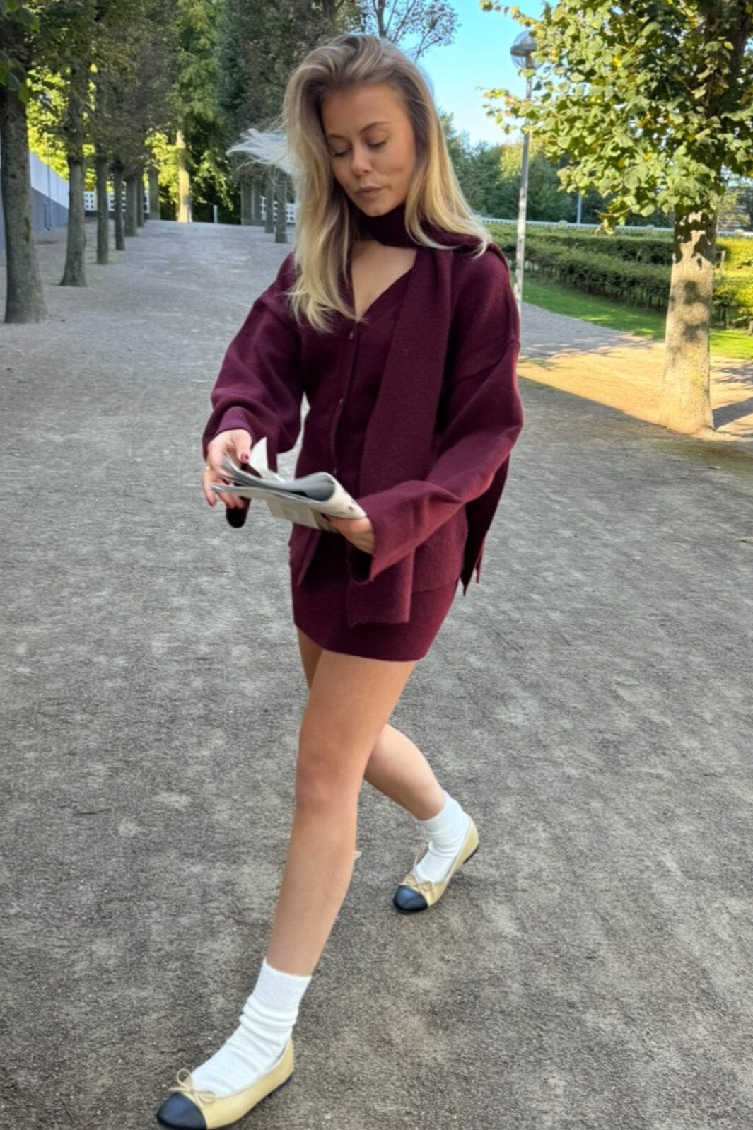 Bordeaux kardigan od BYIC z dużymi rękawami i dopasowanym krojem. Ma dekolt w serek i trzy guziki z przodu.