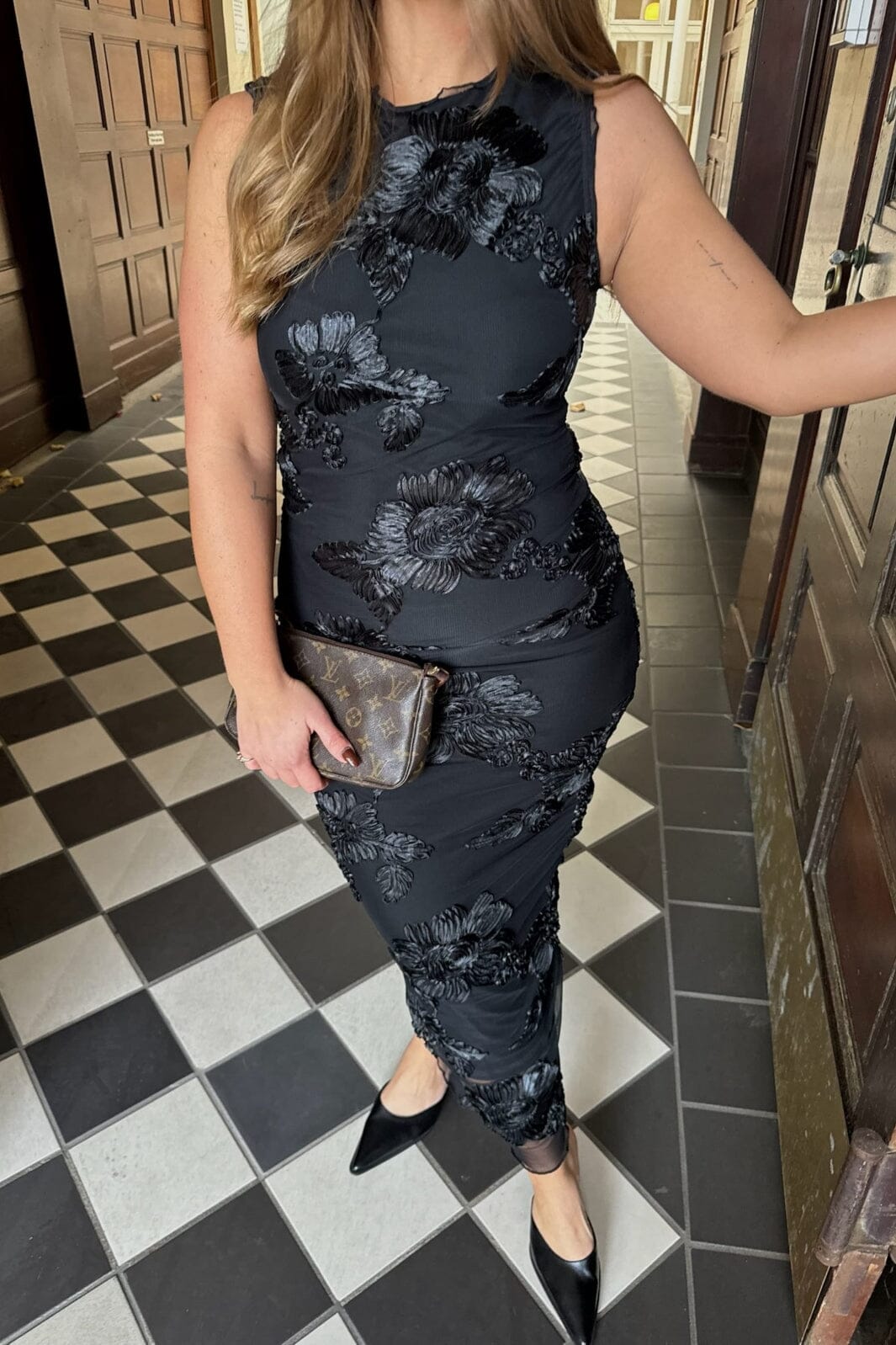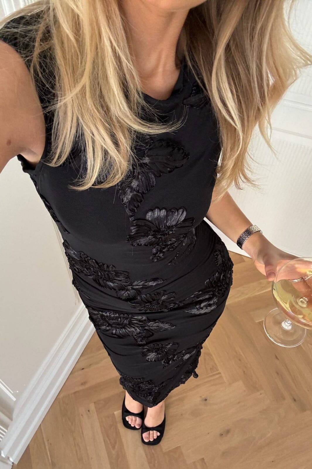 Czarna sukienka z siateczki z haftowanymi kwiatami od BYIC. Sukienka ma dopasowaną sylwetkę i sięga do połowy łydki. Okrągły dekolt i bezrękawnik nadają czysty wygląd.