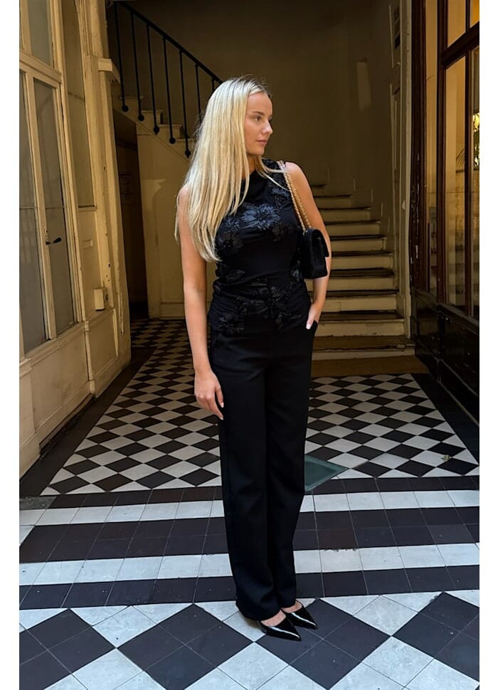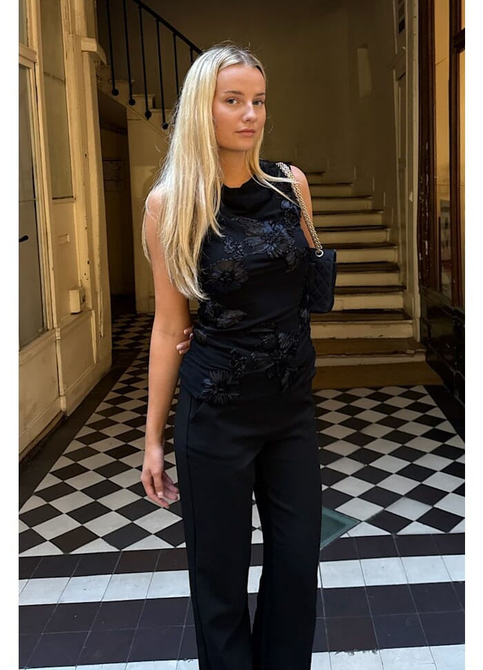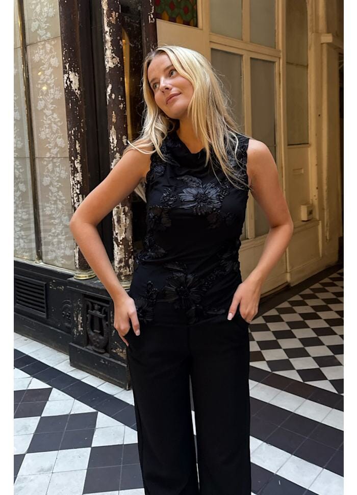 Czarny top z siateczki od BYIC z 3D wzorem kwiatowym. Top ma małe falbanki przy ramionach i detale marszczenia po bokach, które nadają mu strukturę i kształt.