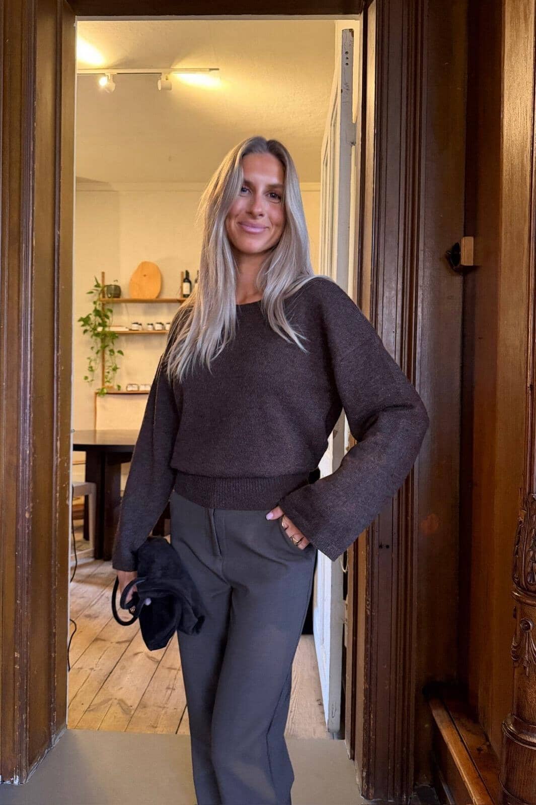 Ciemnobrązowy sweter od BYIC, wykonany z miękkiej dzianiny z poliestru, nylonu i wełny. Kolor to ciepły, ciemnobrązowy odcień.