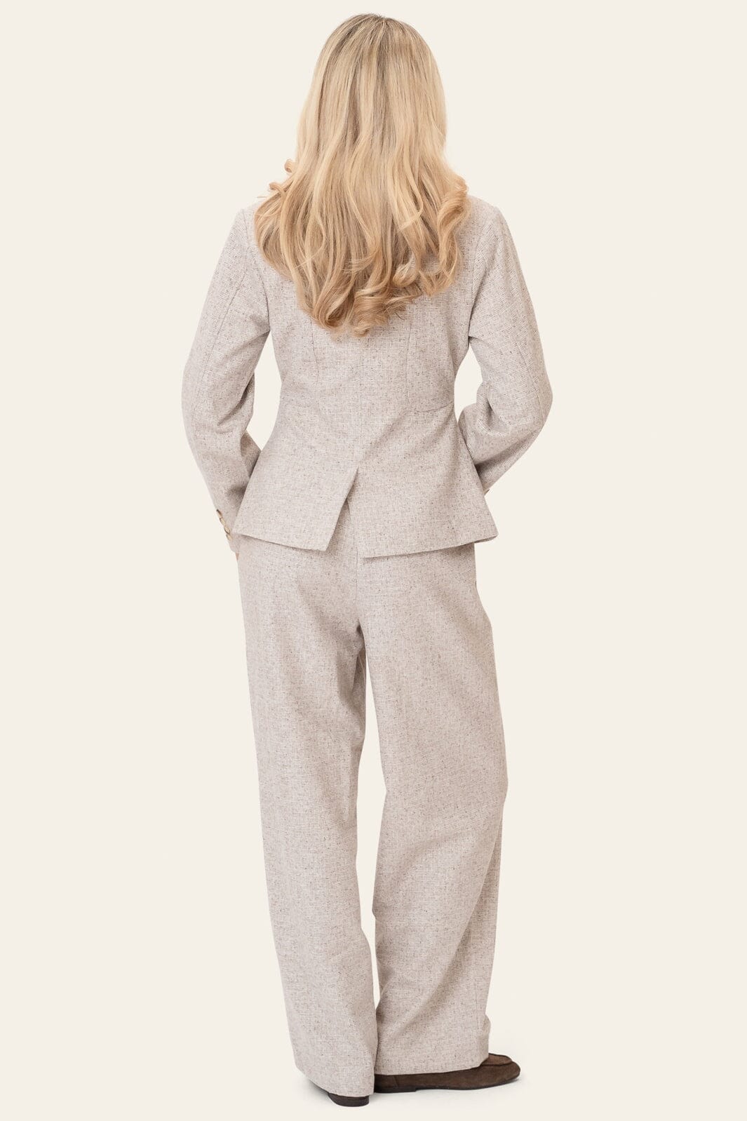 Beżowa marynarka BYIC z tkaniny o wyraźnej strukturze i dopasowaną talią. Marynarka ma kołnierzyk koszulowy, guziki w naturalnym kolorze oraz dwie kieszenie z klapką.