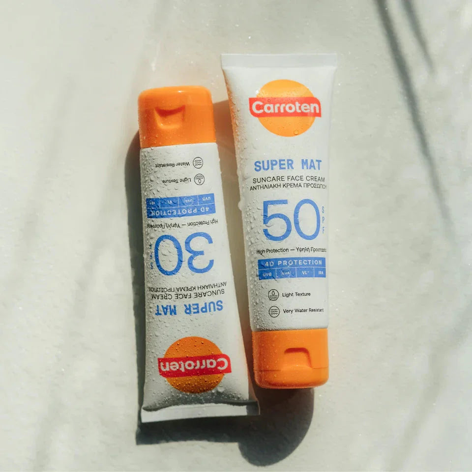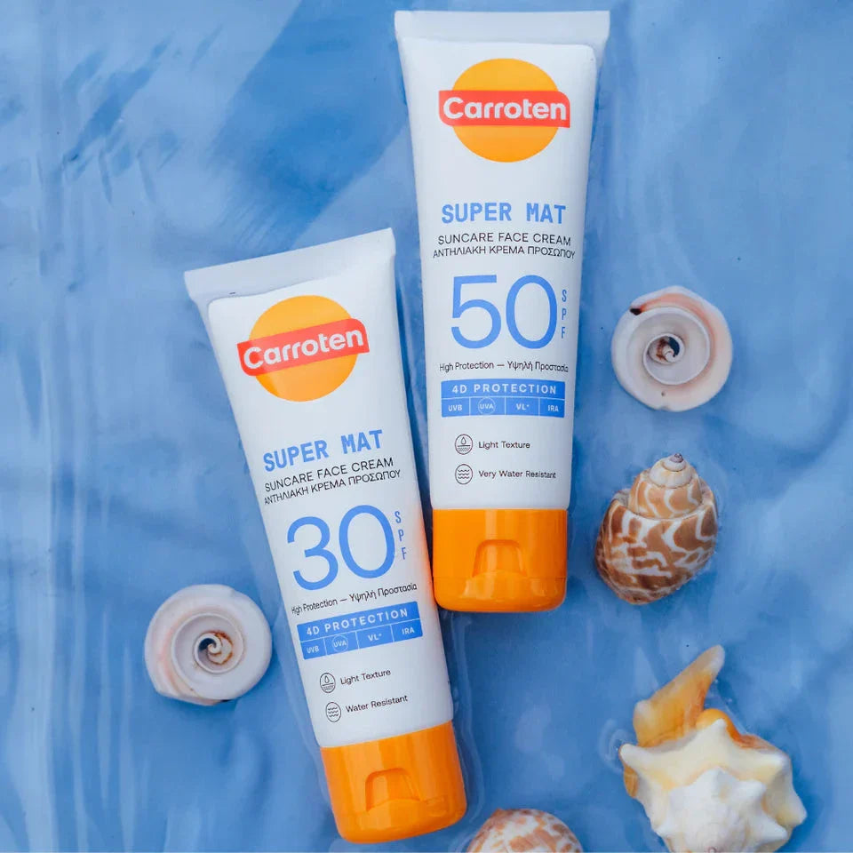 Matowa krem do twarzy od Carroten z SPF 50. Wodoodporna krem przeciwsłoneczny z 4D ochroną przed promieniowaniem UVB, UVA, VL i IRA, specjalnie opracowany dla tłustej skóry.