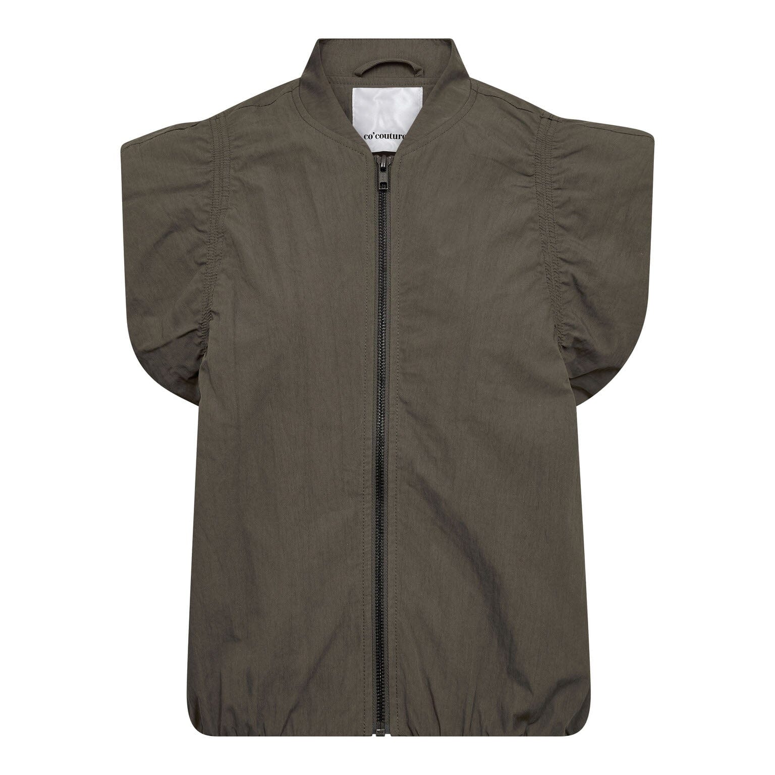 Bezrękownik od Co´Couture w głębokim, wojskowozielonym kolorze. Kamizelka ma bezrękawowy krój z bufiastymi ramionami i wysokim dekoltem.