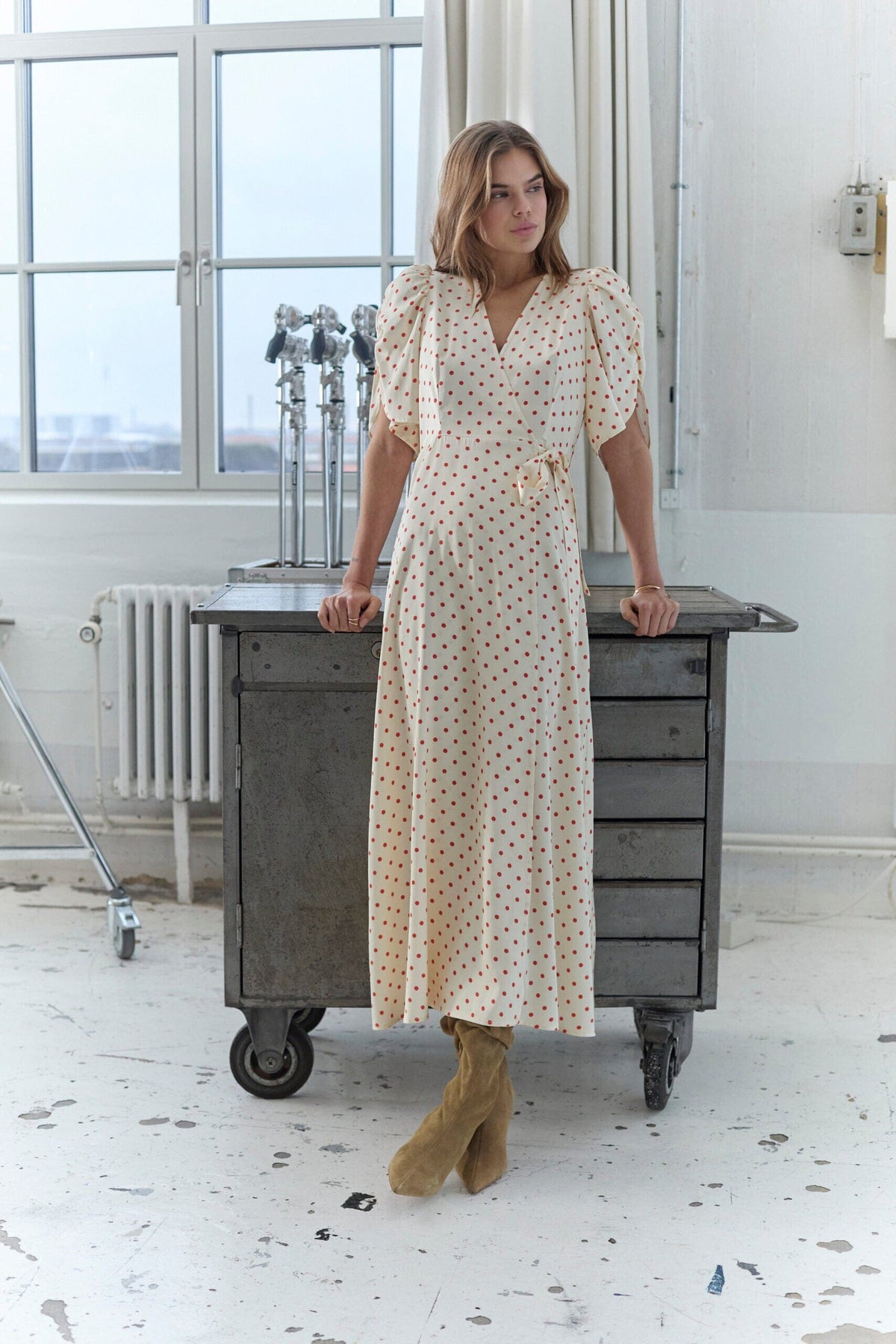 Sukienka kopertowa od Co´Couture w kolorze białym z czerwonymi kropkami. Sukienka ma bufiaste rękawy i dekolt w kształcie litery V, który nadaje kobiecy charakter.