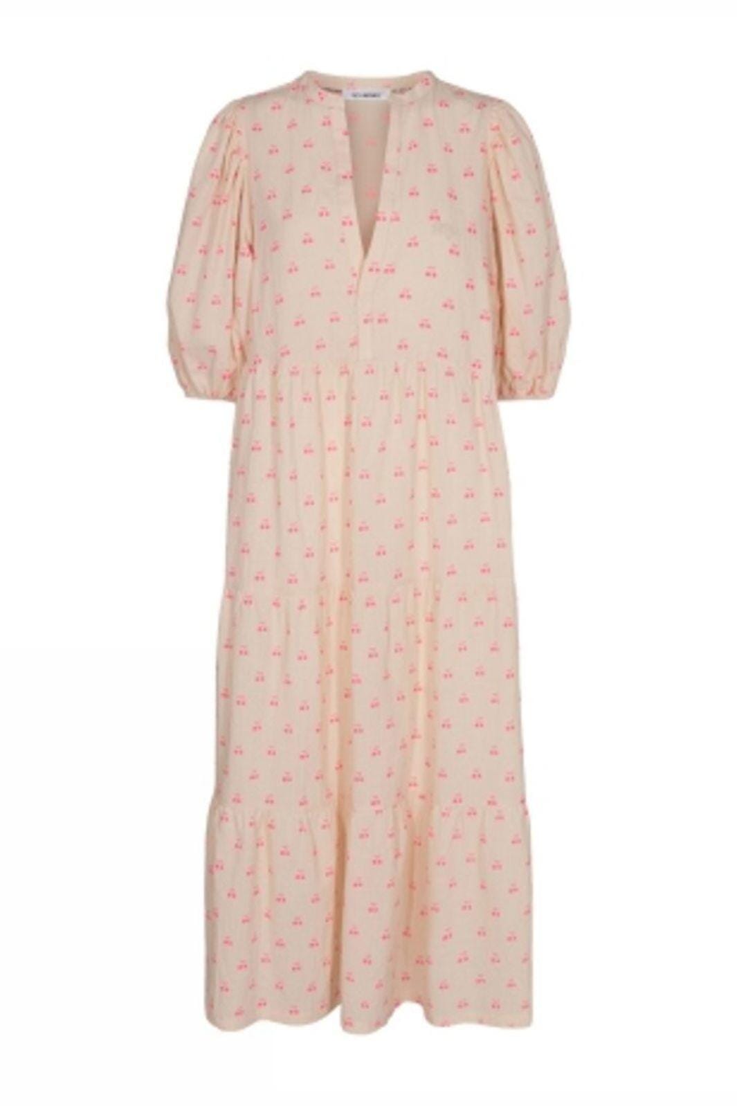 Długa sukienka od Co'Couture z beżowym tłem i neonowo-różowym wzorem wiśni. Sukienka ma dekolt w kształcie litery V z falbanami oraz 3/4 bufiaste rękawy.