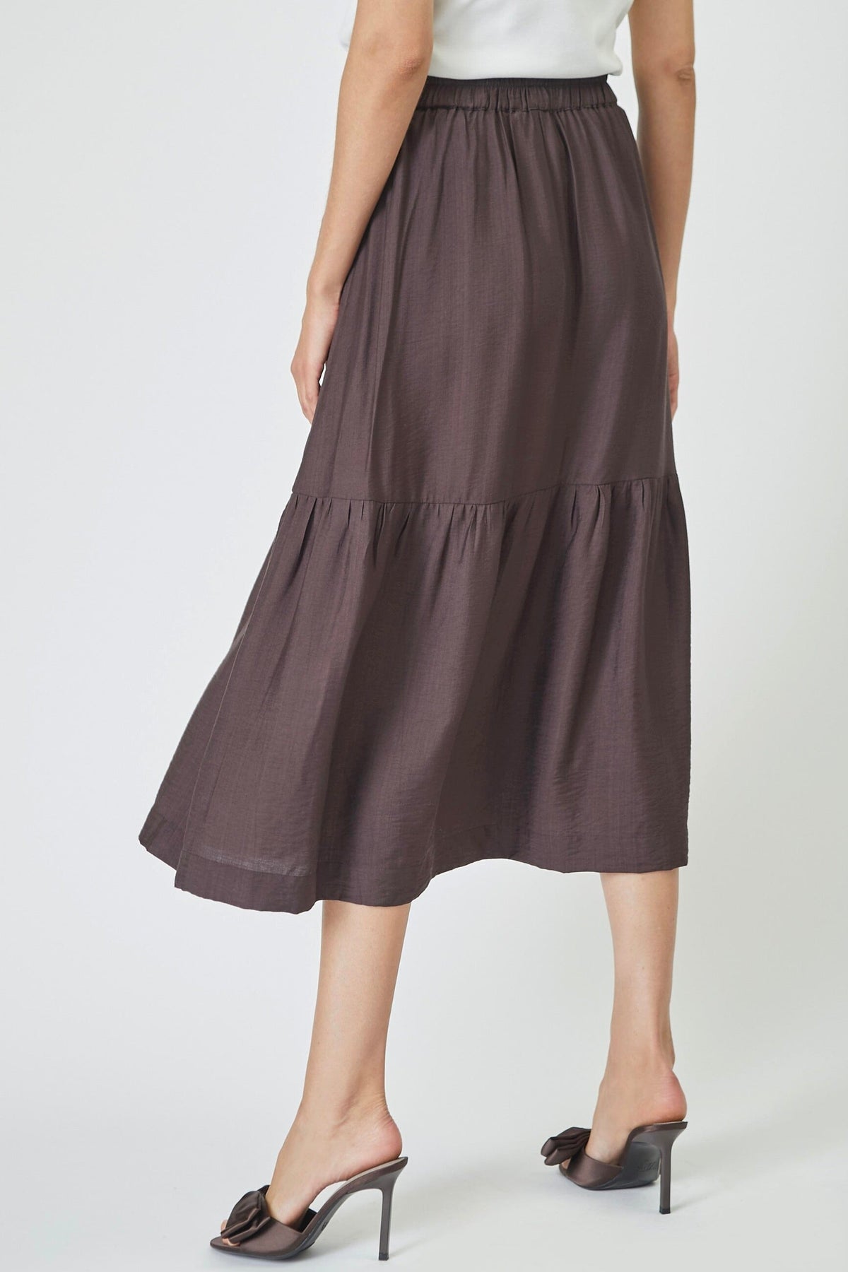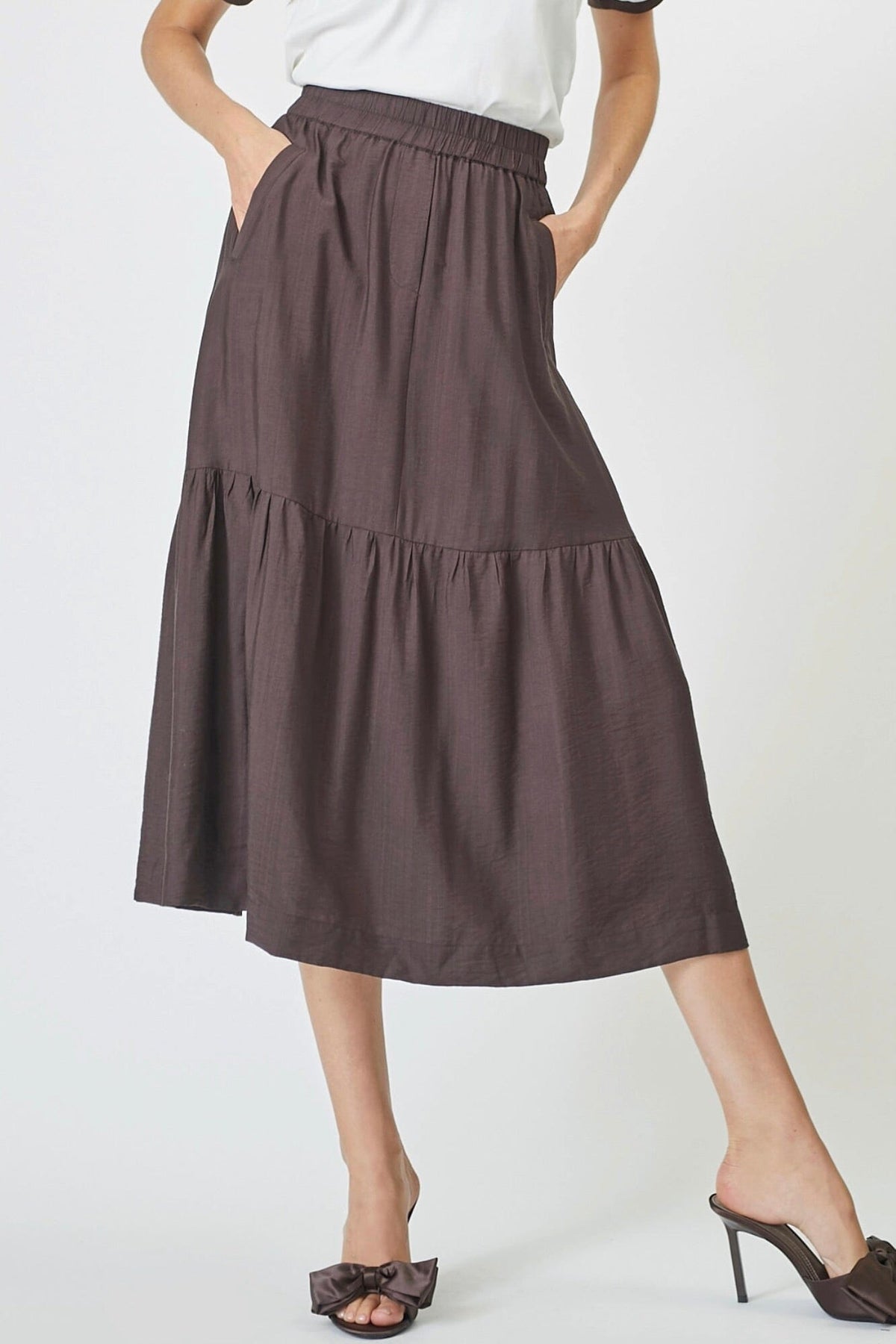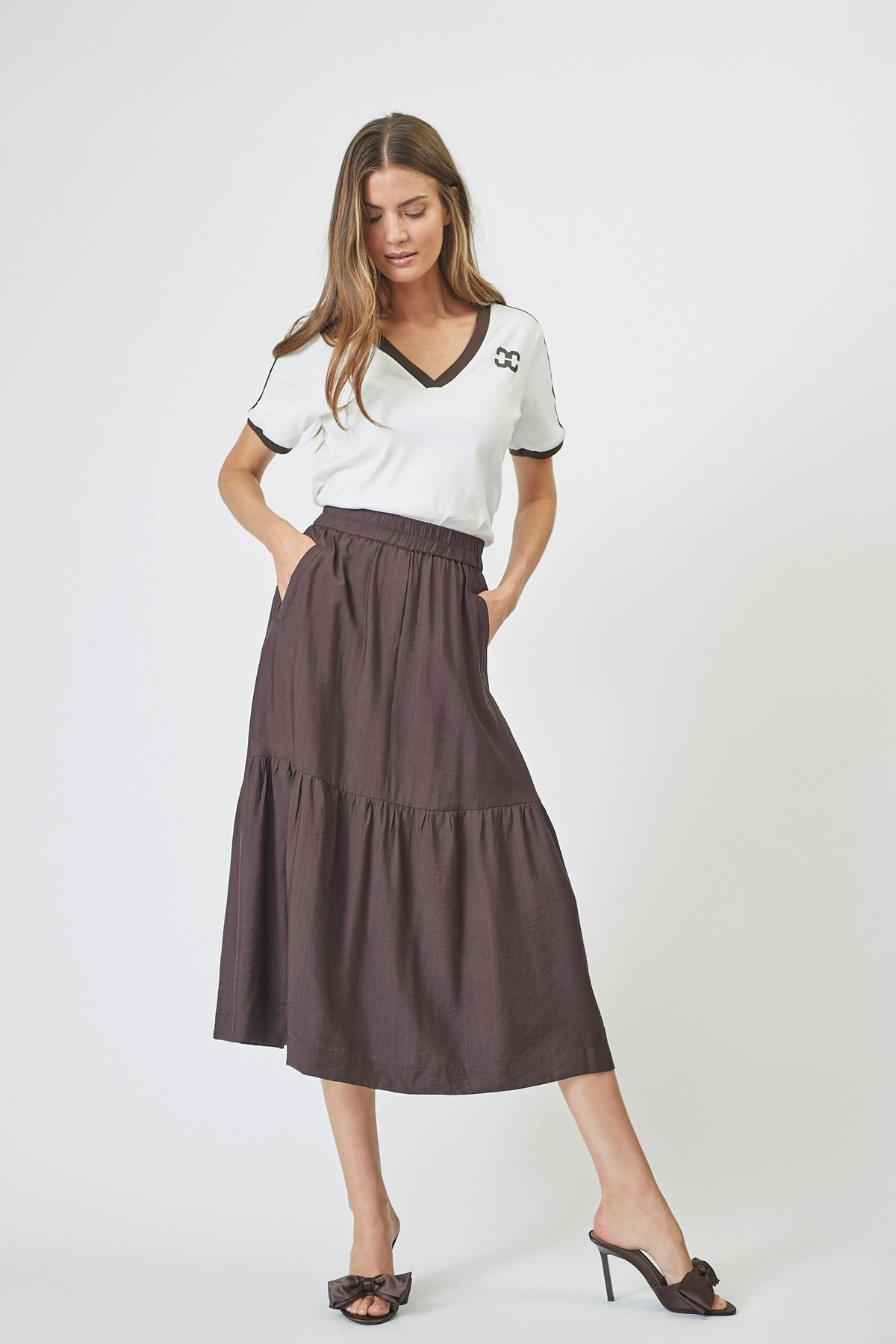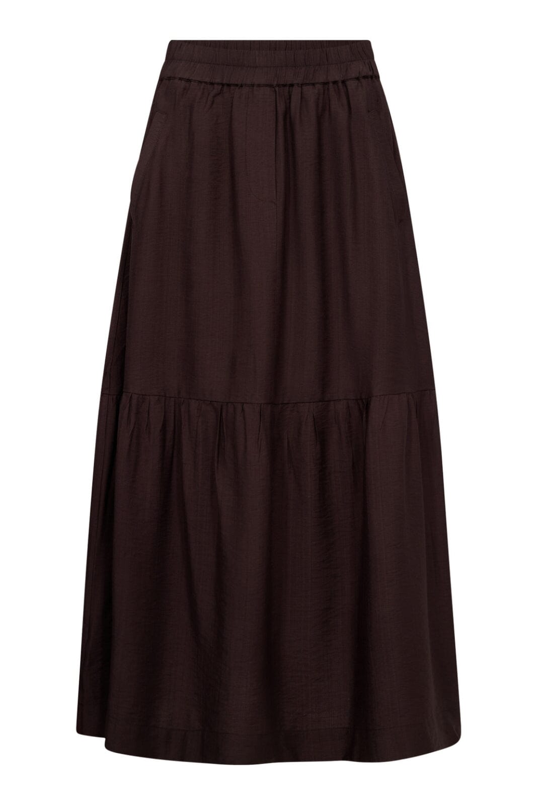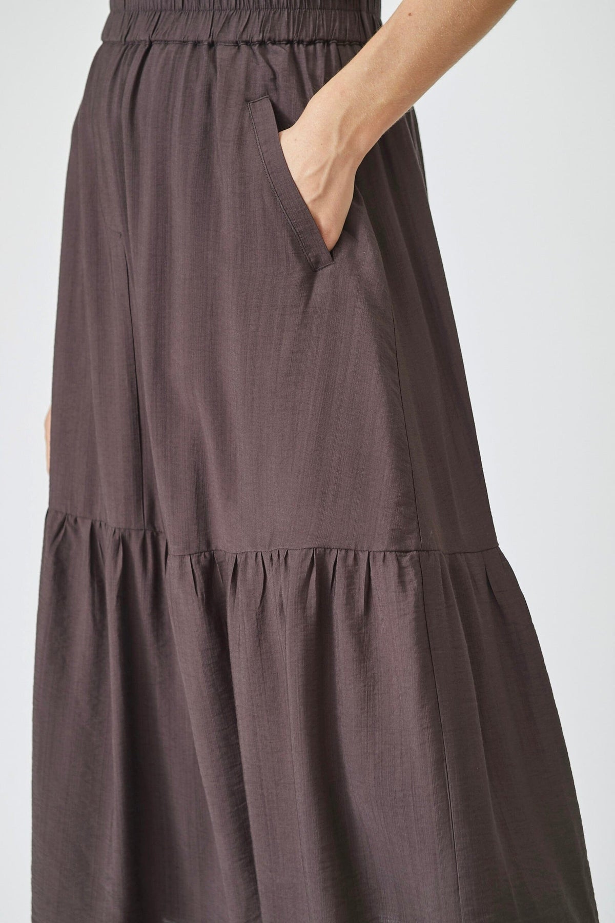 Brąskowy maxi spódnica od Co'Couture z warstwowym designem i falbanami. Długa spódnica ma elastyczny pas i praktyczne kieszenie po bokach.