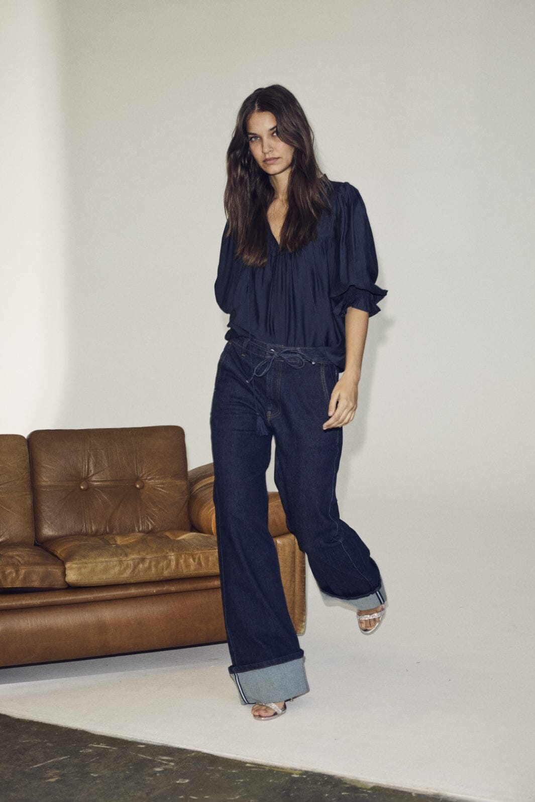 Granatowa bluzka od Co´couture z bufkami i detalami z koronki. Bluzka ma dekolt V i sznurek z chwostami, co nadaje jej lekki i przewiewny wygląd.