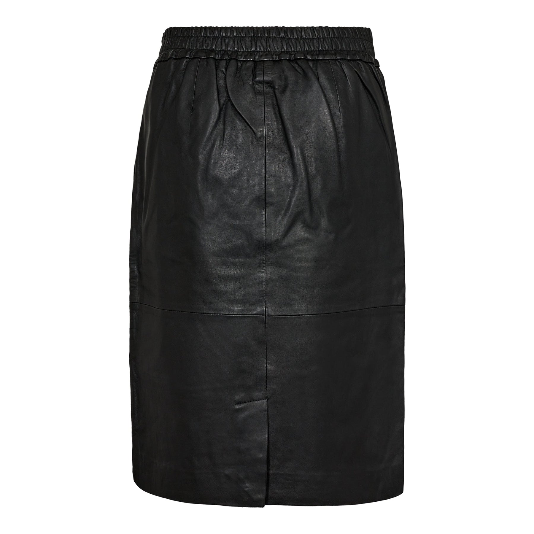 Czarna skórzana spódnica o kroju ołówkowym z elastycznym pasem. Spódnica ma długość do kolan i regularny krój, co sprawia, że nadaje się zarówno na co dzień, jak i na imprezy.