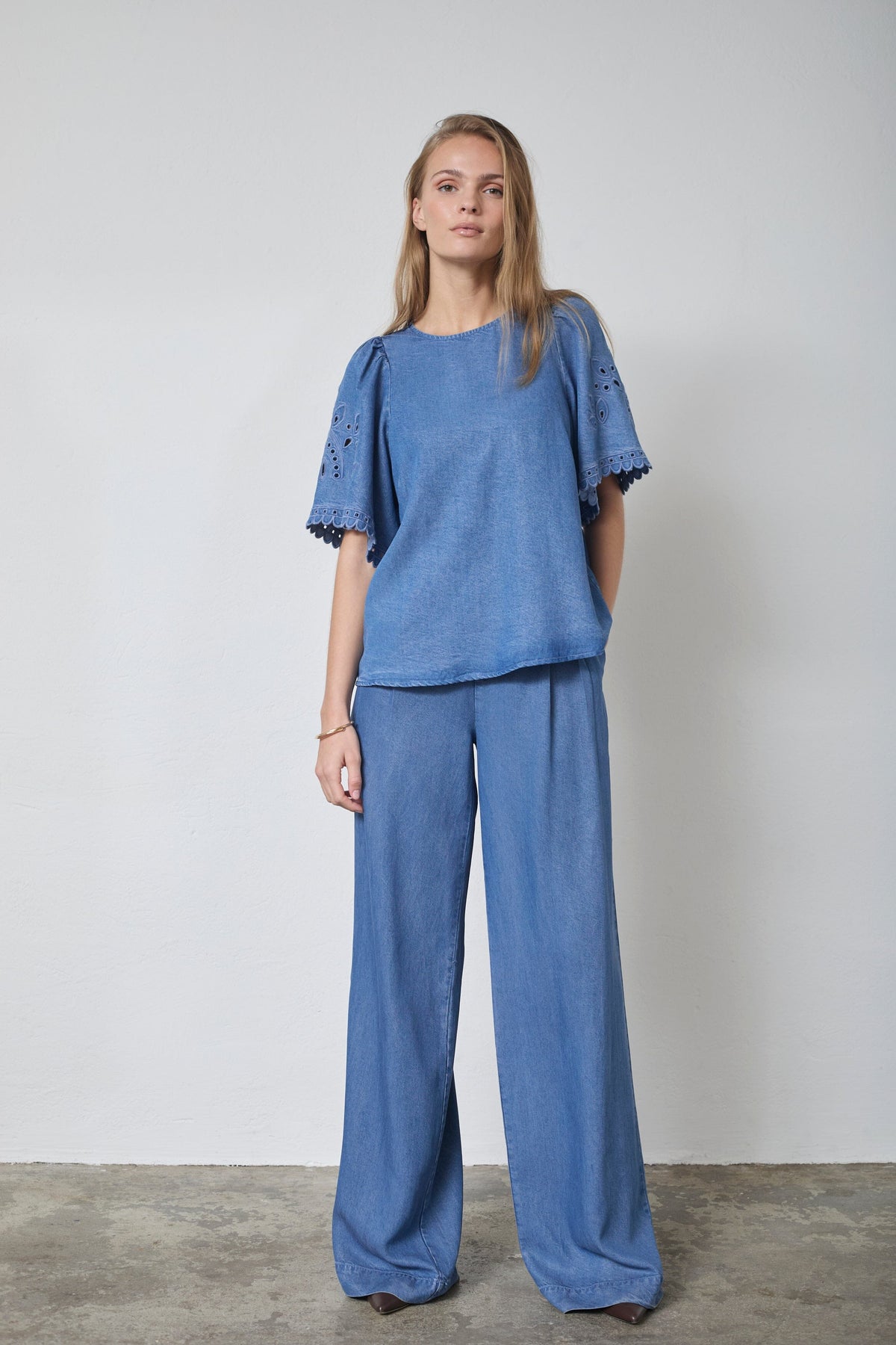 Niebieska bluzka marki Co´Couture wykonana w 100% z lyocellu. Bluzka ma haftowane detale na rękawach oraz falisty dół.