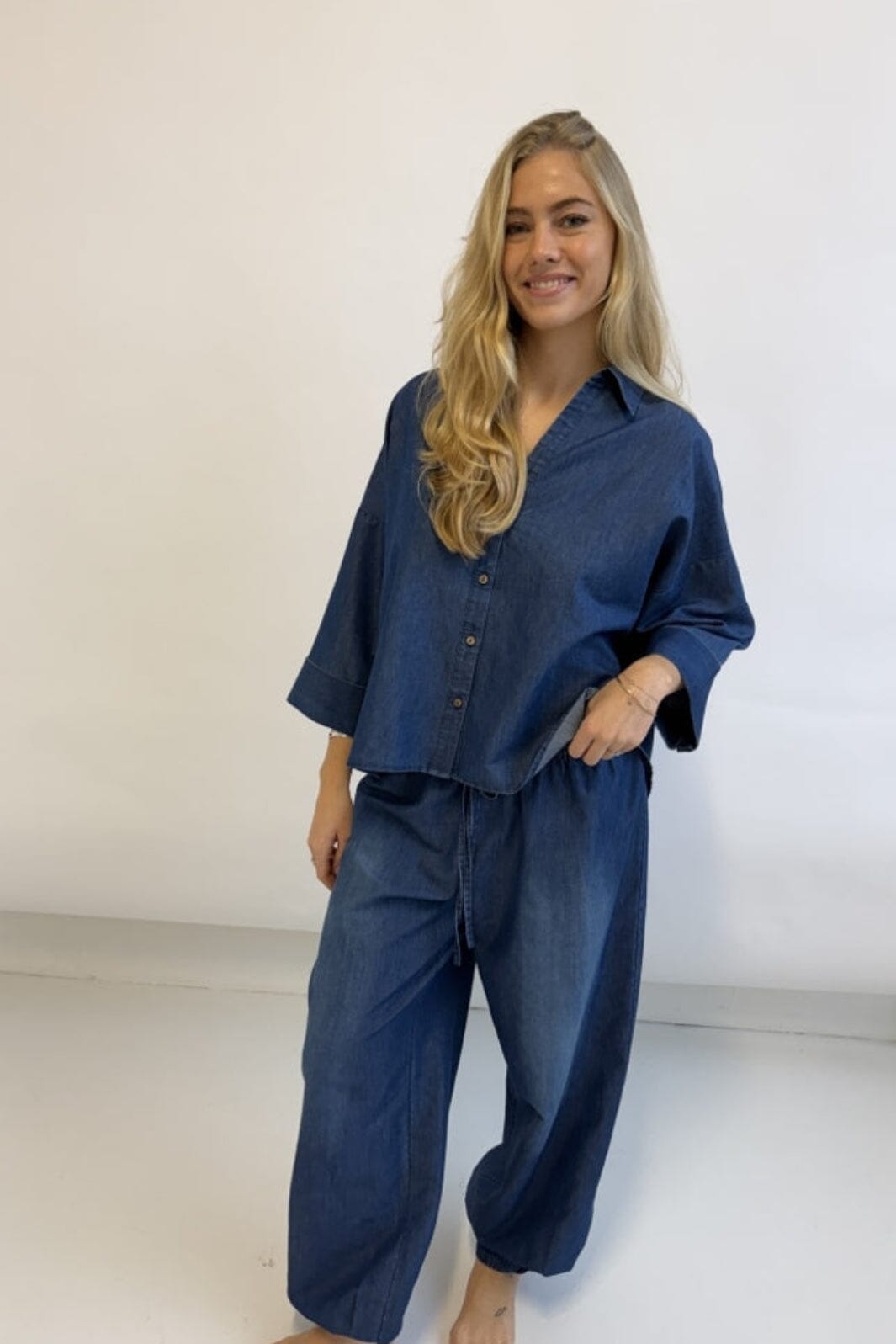 Dopasowany zestaw marki Continue z topem i spodniami w niebieskim odcieniu. Wykonany w 30% z bawełny i w 70% z poliamidu.