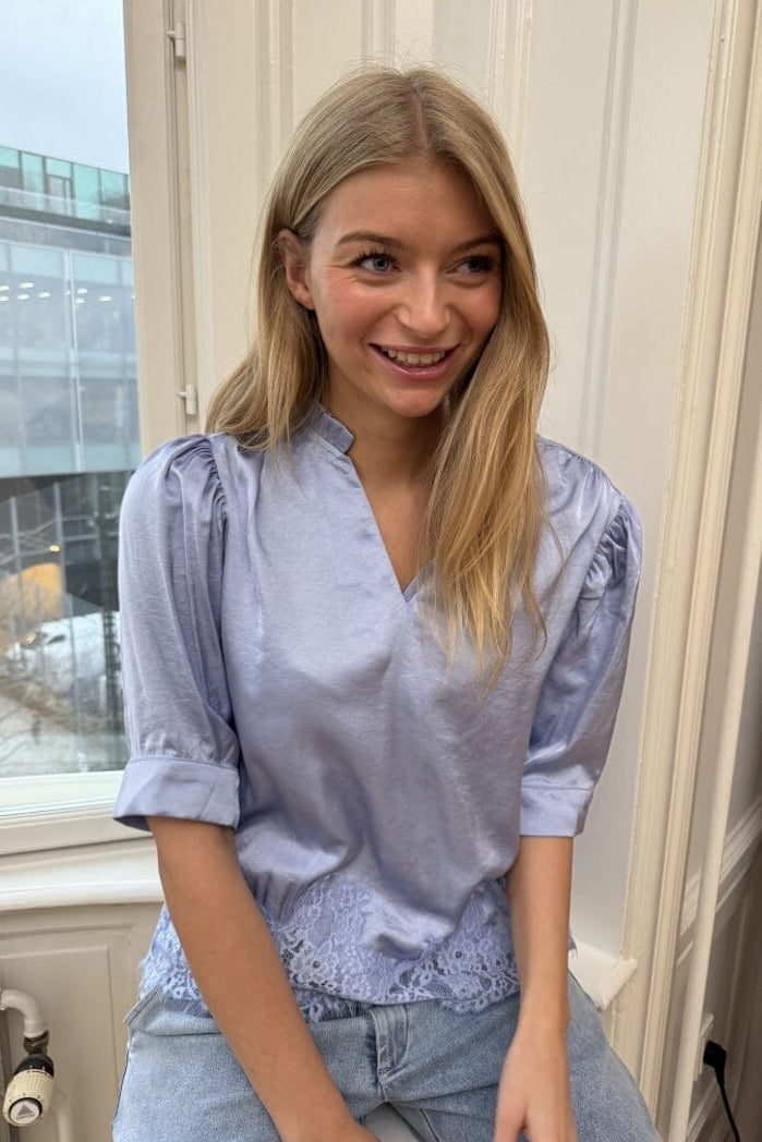 Jasnoniebieska bluzka marki Continue, wykonana z poliestru i wiskozy. Bluzka ma dekolt w kształcie litery V, rękawy 3/4 oraz koronkowe detale u dołu.