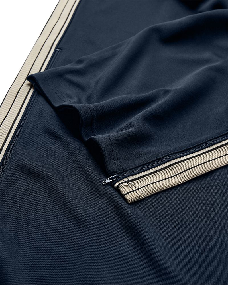 Dresowe spodnie od Copenhagen Muse w ciemnoniebieskim kolorze. Spodnie mają lampasy wzdłuż boków oraz wysoki stan z elastyczną talią i troczkiem.