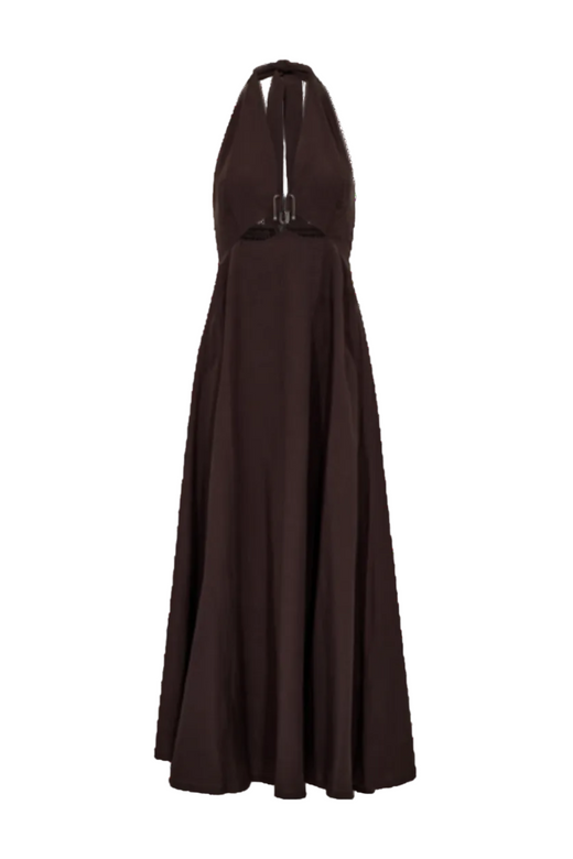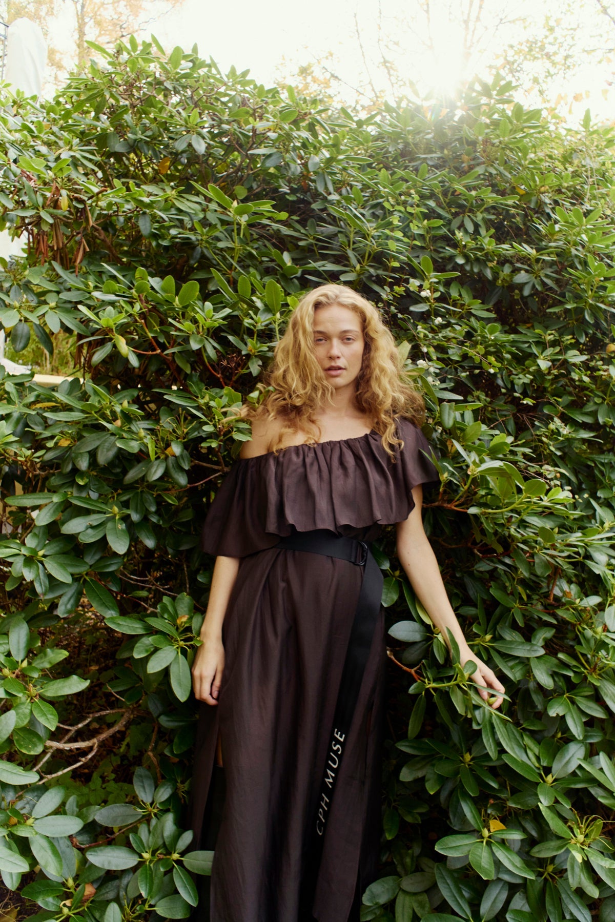 Ciemnobrązowa sukienka hiszpanka od Copenhagen Muse, wykonana w 85% z lyocellu i w 15% z poliestru. Sukienka ma szeroką falbanę u góry oraz czarny pasek z nadrukowanym logo.