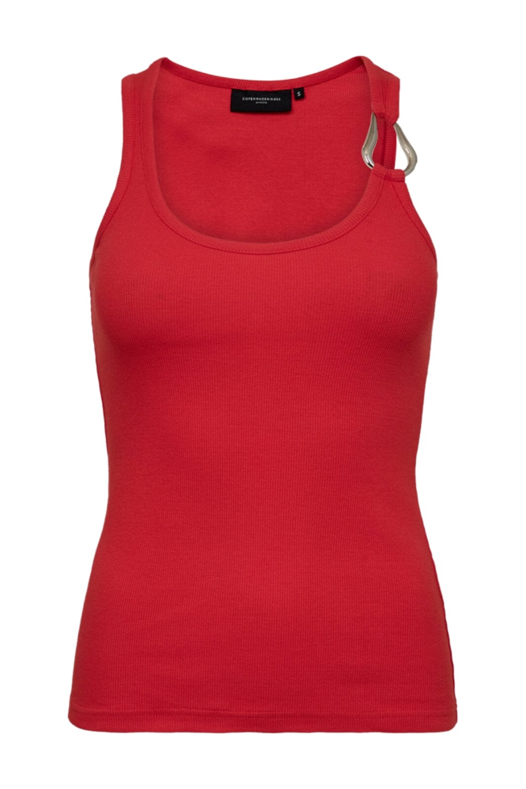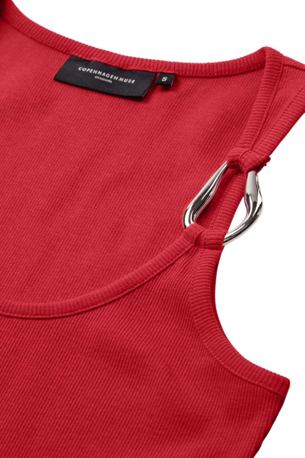 Tomatowa bluzka od Copenhagen Muse z prążkowaną teksturą i okrągłym dekoltem. Srebrny klips na ramiączku nadaje bluzce wyjątkowy charakter, podczas gdy dopasowany krój podkreśla sylwetkę.