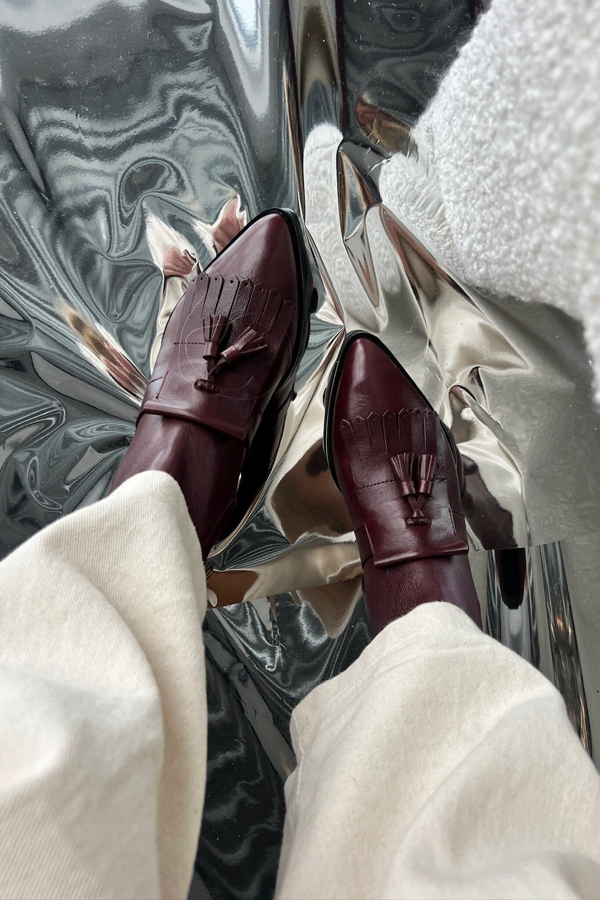 Botki od Copenhagen Shoes, wykonane ze skóry w ciepłym odcieniu bordo. Buty mają chwosty i frędzle na podbiciu, spiczasty nosek oraz praktyczny zamek błyskawiczny po wewnętrznej stronie.