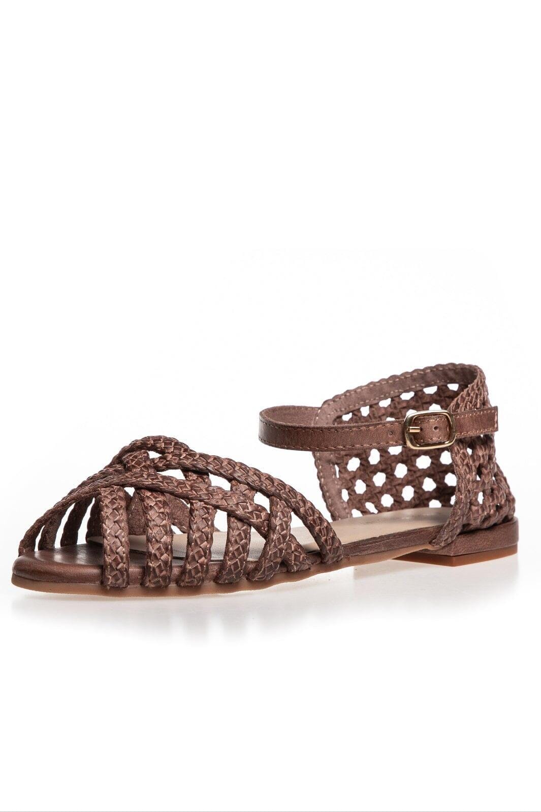 Brązowe sandały od Copenhagen Shoes, wykonane ze skóry. Sandał ma pleciony design oraz pasek na kostce z klamrą.