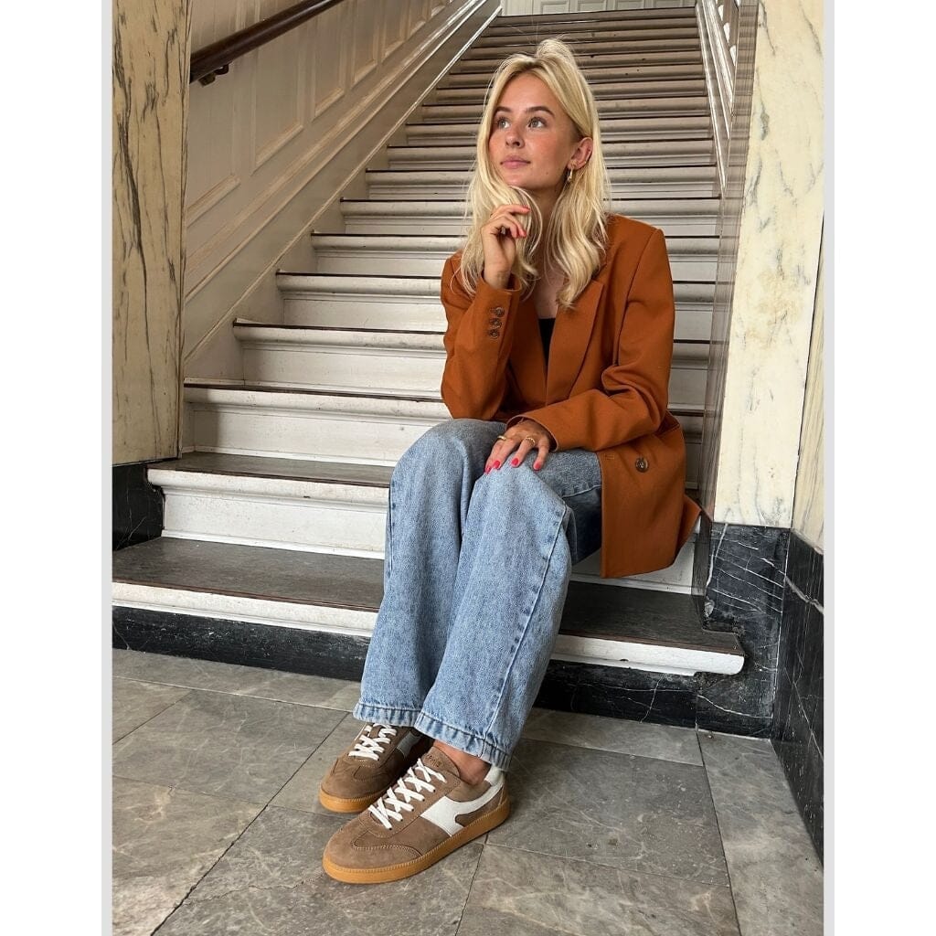 Sneakersy od Copenhagen Shoes z zamszu w neutralnym kolorze taupe. Buty mają białe detale i gumową podeszwę, która nadaje swobodny i praktyczny wygląd.