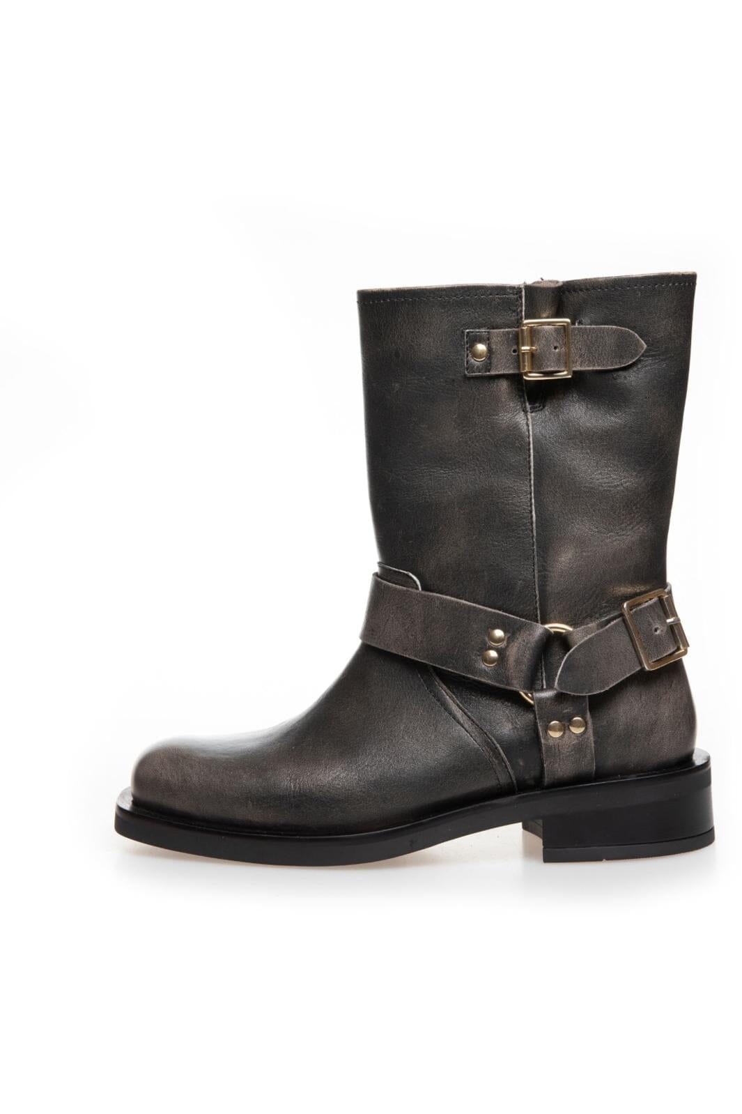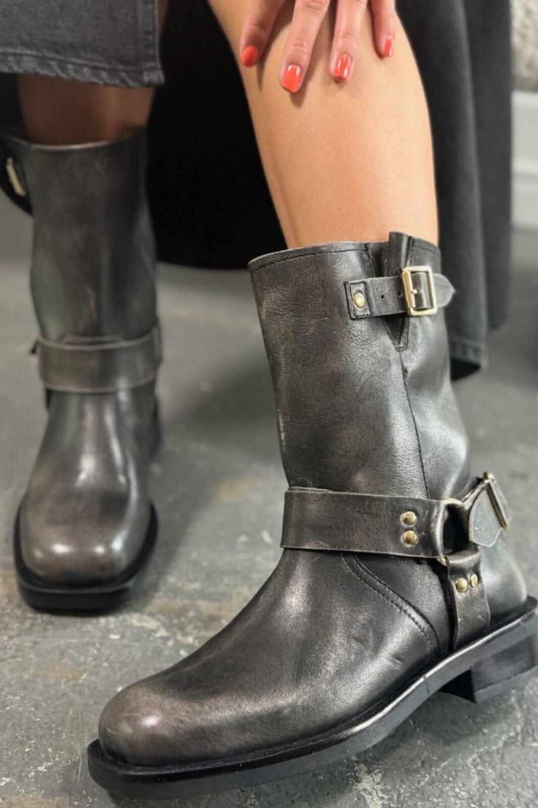 Czarnie i szare botki od Copenhagen Shoes z błyszczącej skóry. Botki mają zapięcie na klamrę z złotymi detalami i kwadratowy czubek.