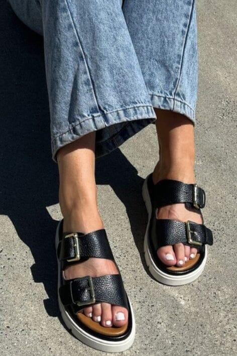 Czarne sandały od Copenhagen Shoes z skóry z wyraźną platformą. Dwie regulowane klamry i mocna podeszwa nadają sandałom ich charakterystyczny wygląd.