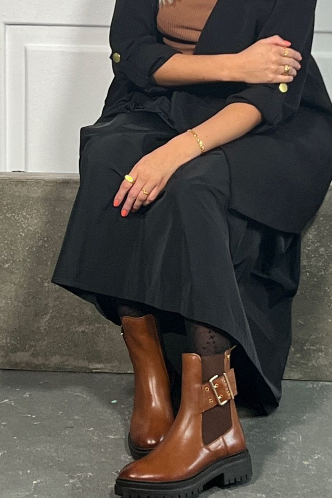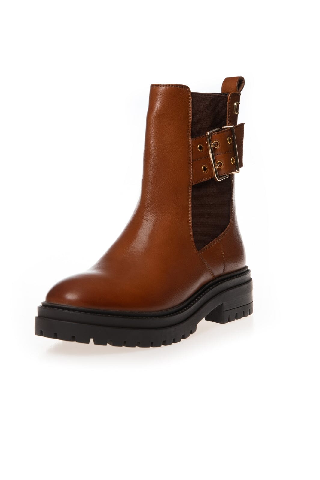 Botki od Copenhagen Shoes z skóry z wykończeniem w kolorze koniaku. Botki mają solidną podeszwę i klamrę z boku. Okrągłe noski nadają klasyczny kształt.