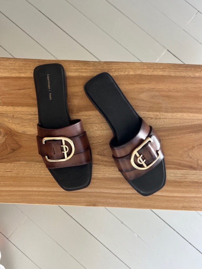 Brązowe klapki od Copenhagen Shoes, wykonane ze skóry, ze złotą klamrą i kwadratowym noskiem.