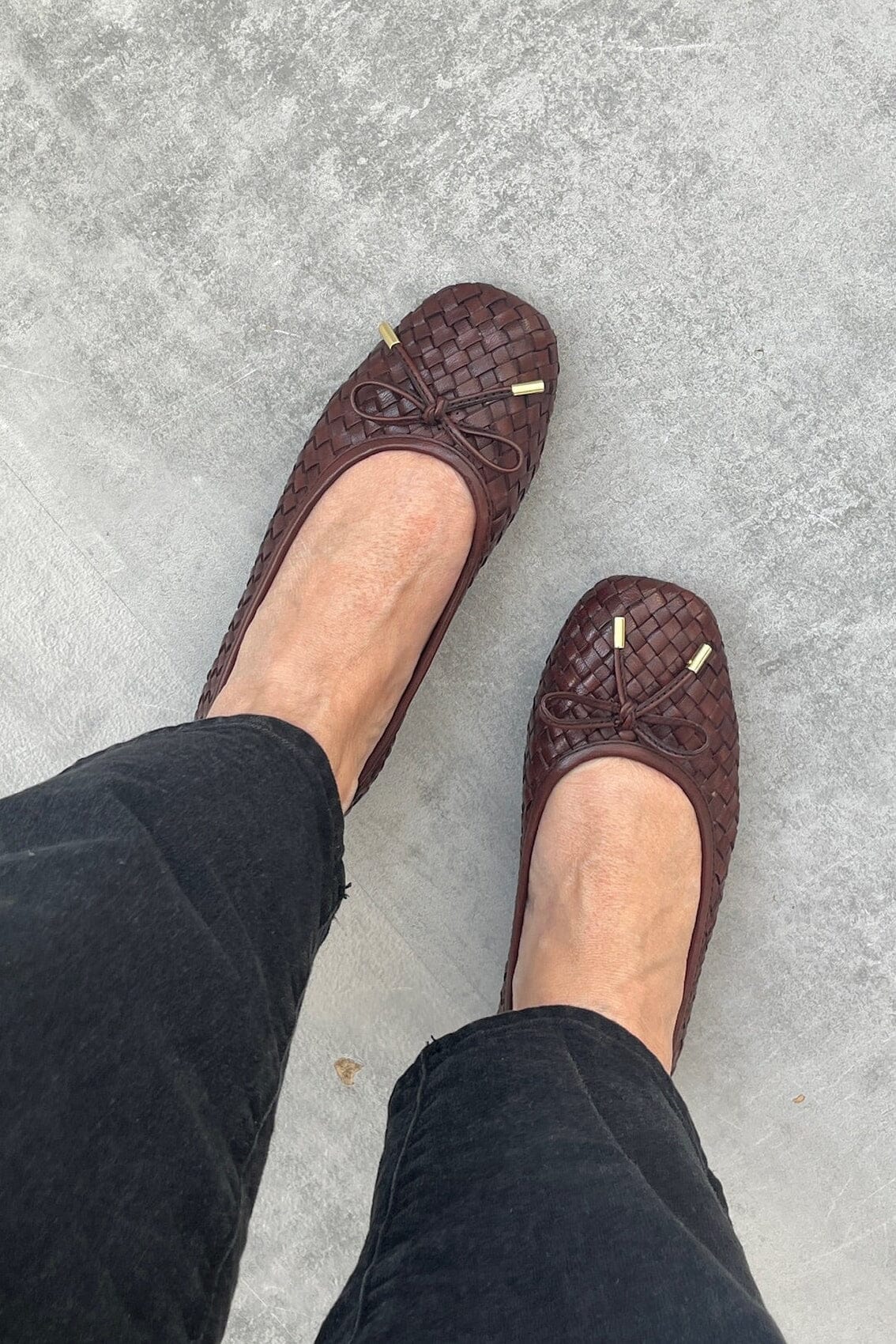 Baleriny marki Copenhagen Shoes z ciemnobrązowej skóry z plecioną powierzchnią i dekoracyjną kokardą z przodu z metalowymi końcówkami.