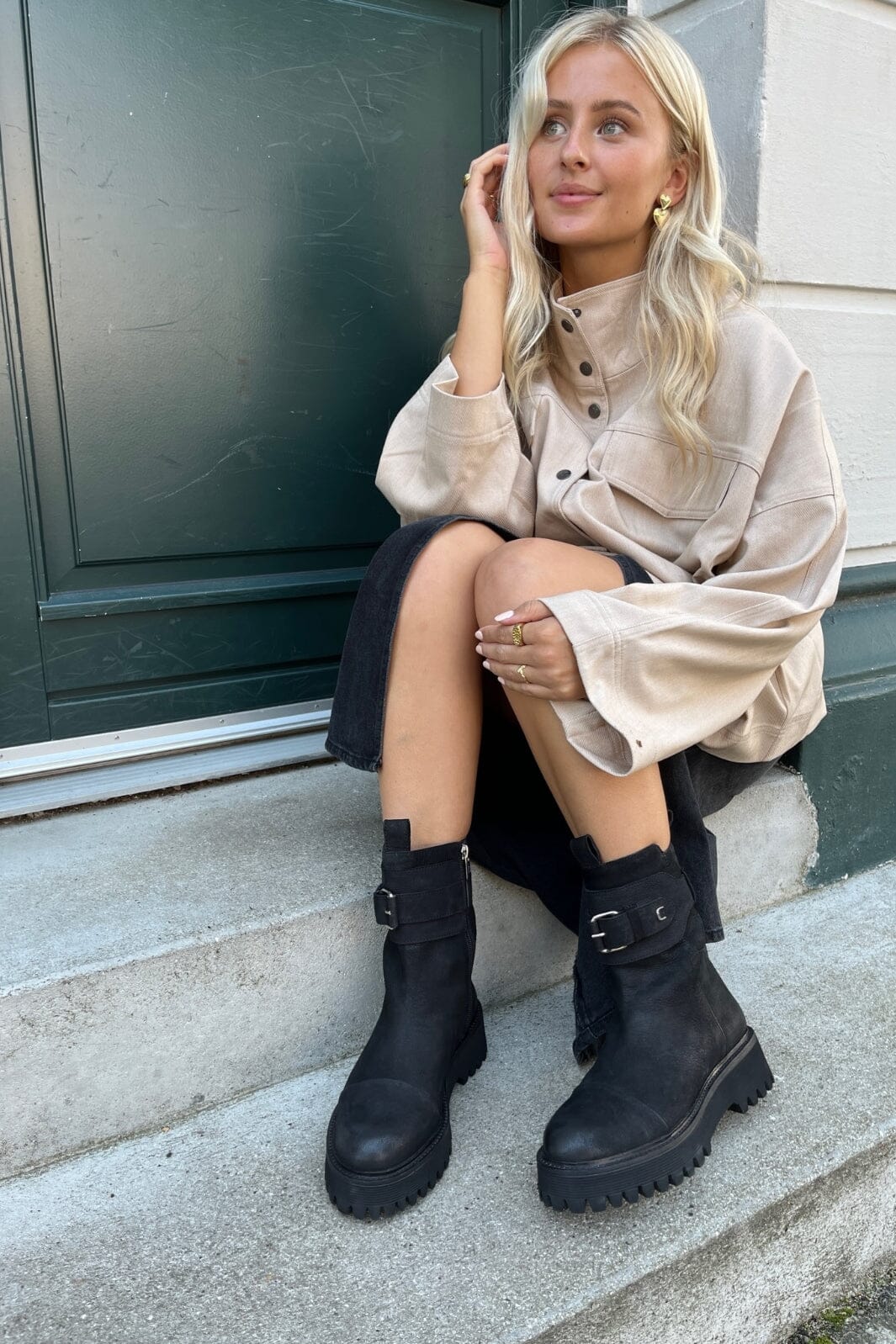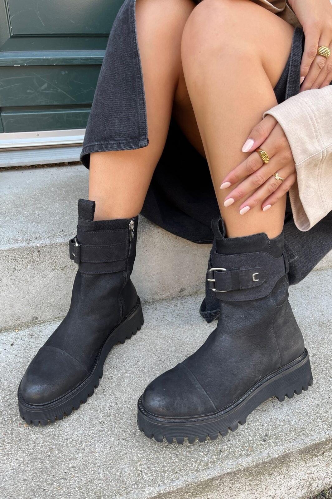 Czarne botki od Copenhagen Shoes z nubuku z mocną podeszwą. Botki mają solidną konstrukcję z zamkiem błyskawicznym i klamrą z boku.