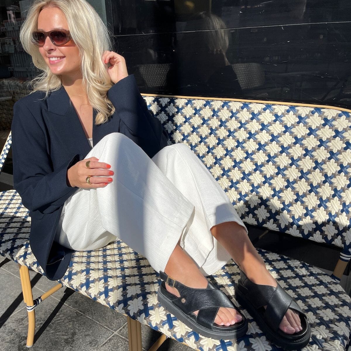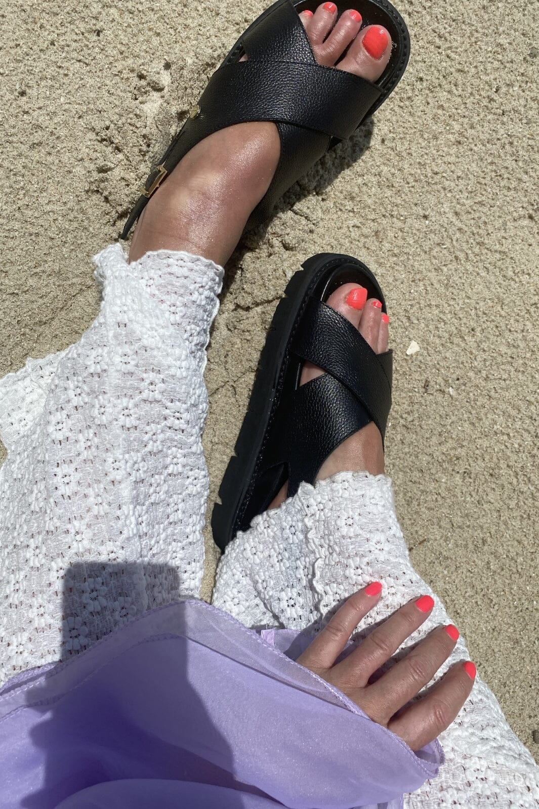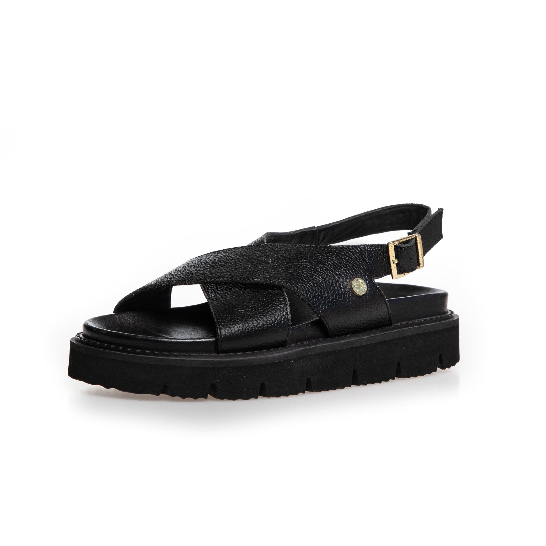Czarne skórzane sandały od Copenhagen Shoes z krzyżowym wzorem na stopie. Sandały mają pozłacaną klamrę na pasku pięty i podeszwy EVA z dobrą amortyzacją.