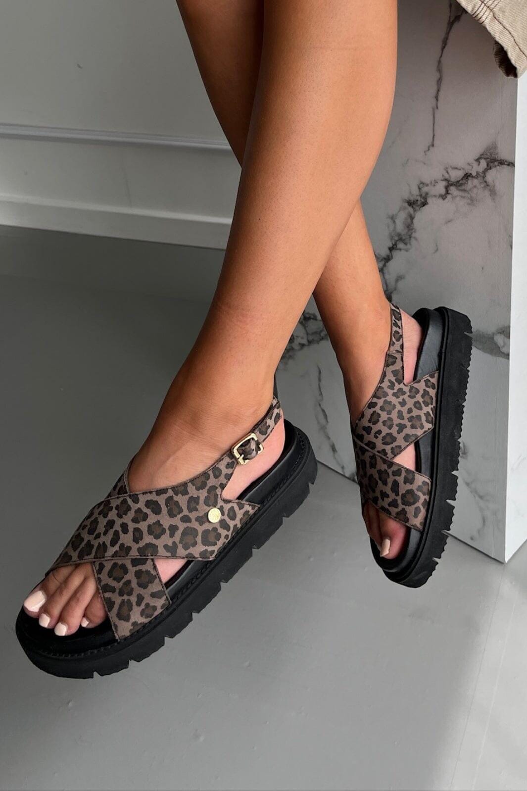 Sandały od Copenhagen Shoes z zamszu w czarno-brązowy wzór w panterkę. Sandały mają krzyżujące się paski na stopie oraz praktyczne zapięcie na klamrę przy kostce.