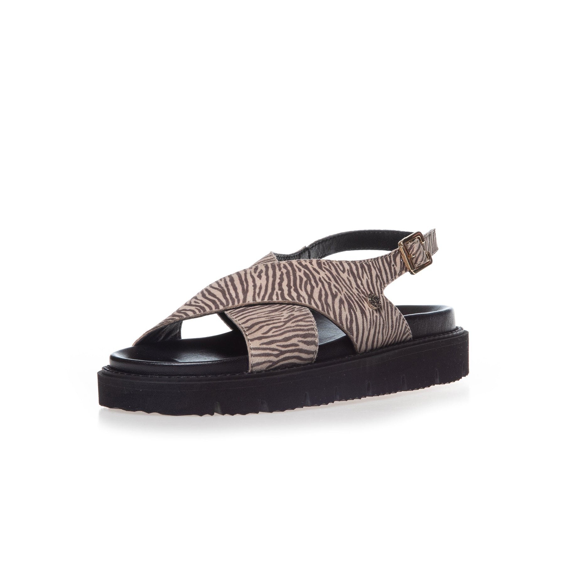 Sandały marki Copenhagen Shoes, wykonane z zamszu w beżowych i brązowych odcieniach. Sandały mają krzyżujący się design z grubą, czarną podeszwą.