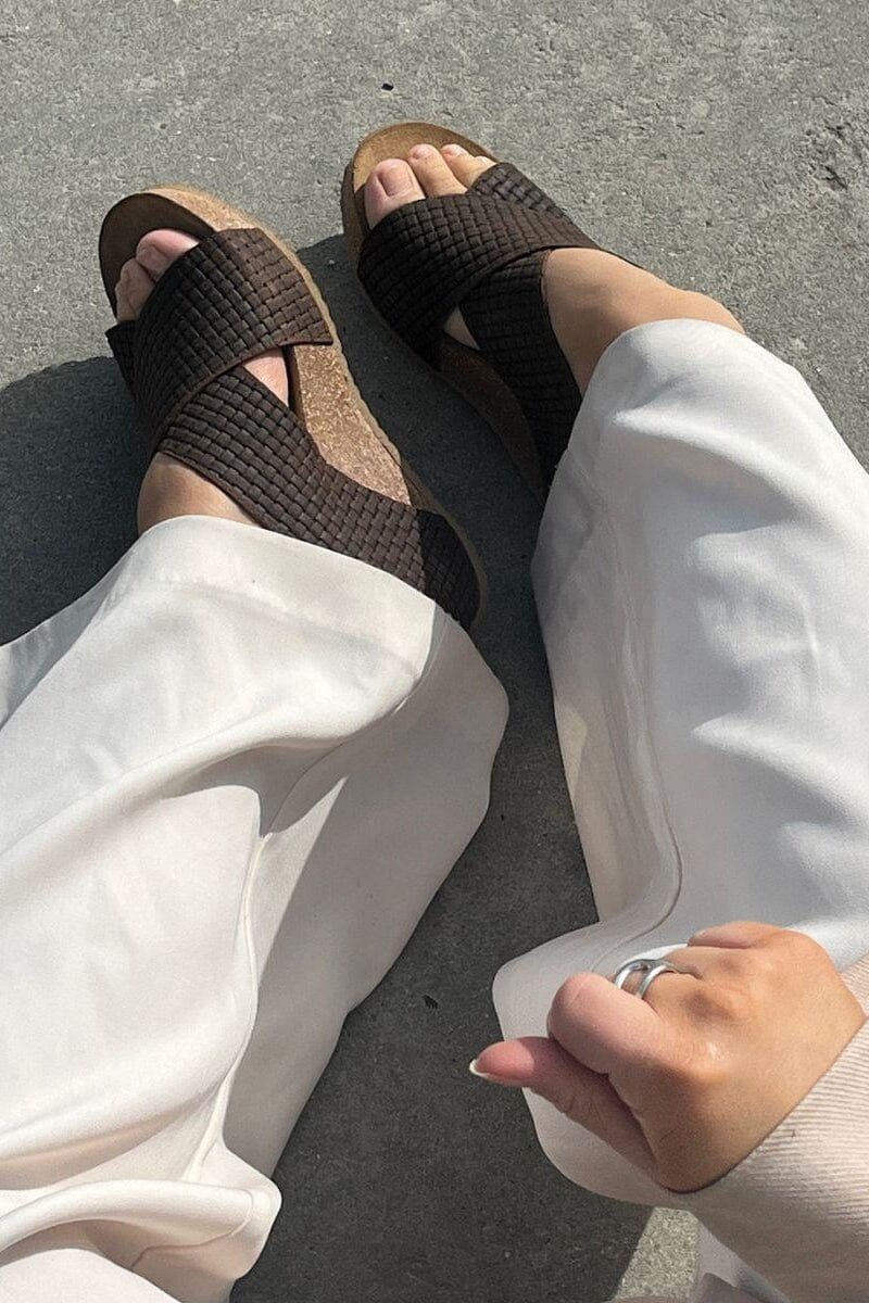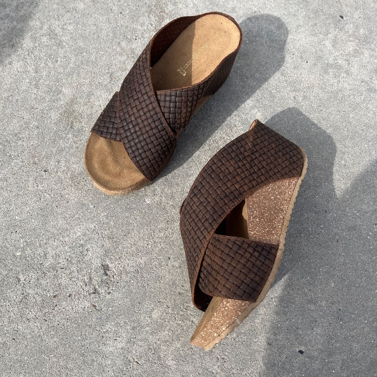 Sandały marki Copenhagen Shoes z ciemnobrązowego zamszu z krzyżującymi się paskami i koturnem w stylu przypominającym korek.