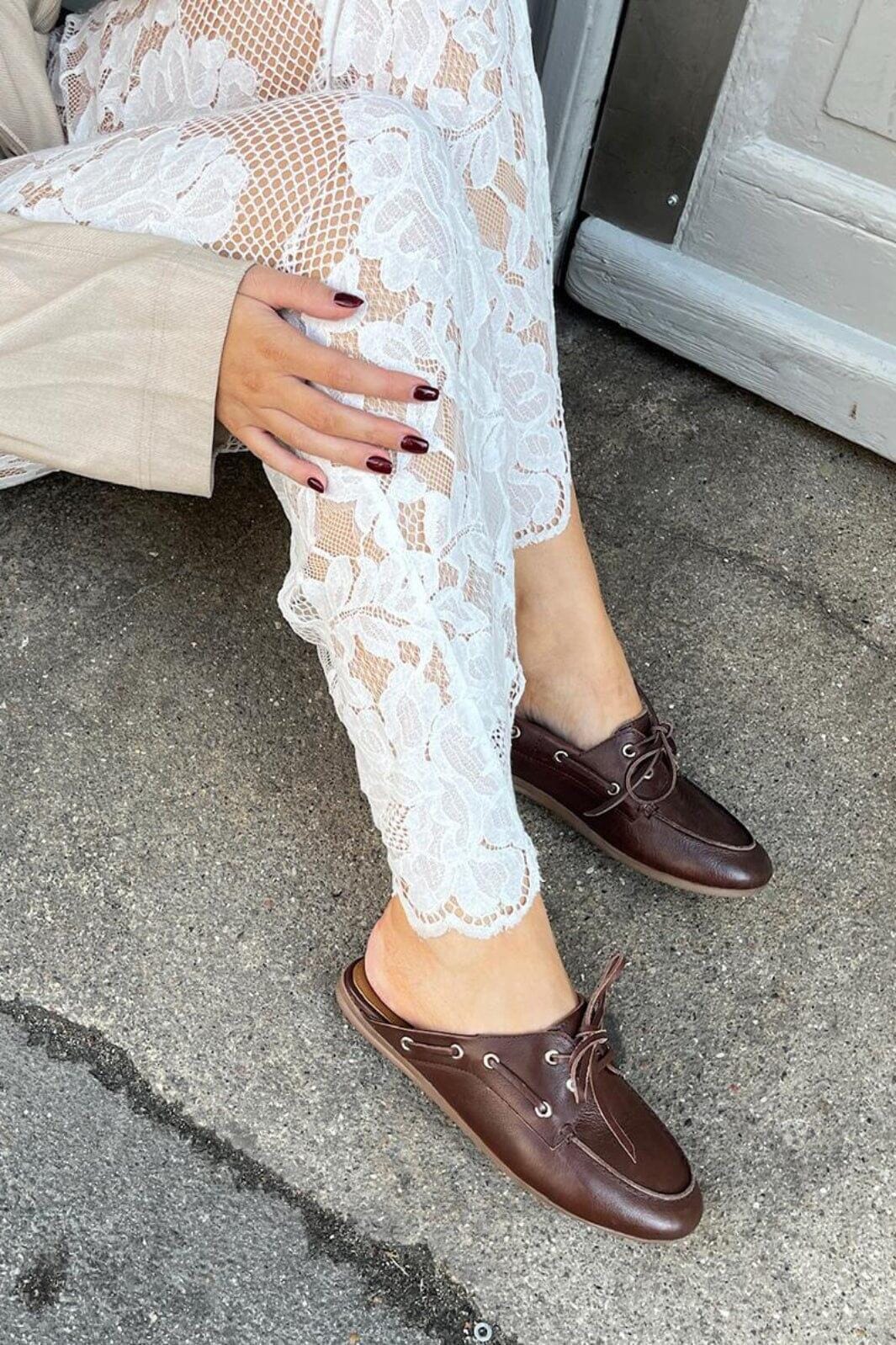 Brązowe loafersy od Copenhagen Shoes, wykonane ze skóry. Buty mają wsuwany fason z ozdobnymi sznurówkami i metalowymi oczkami.