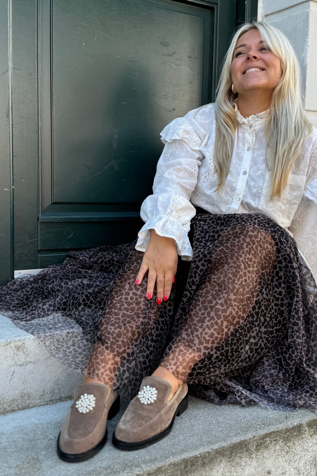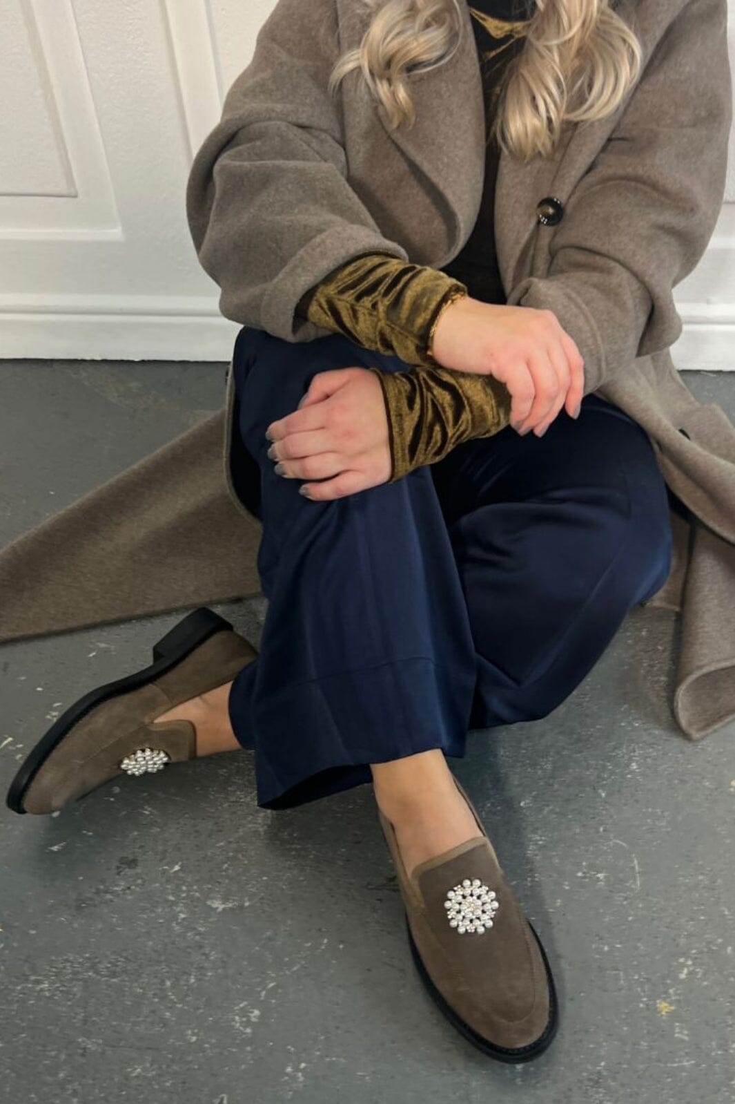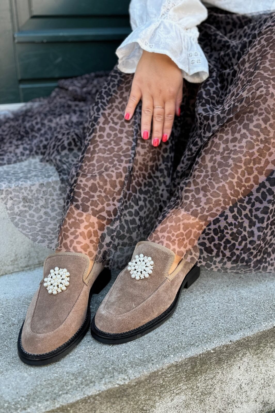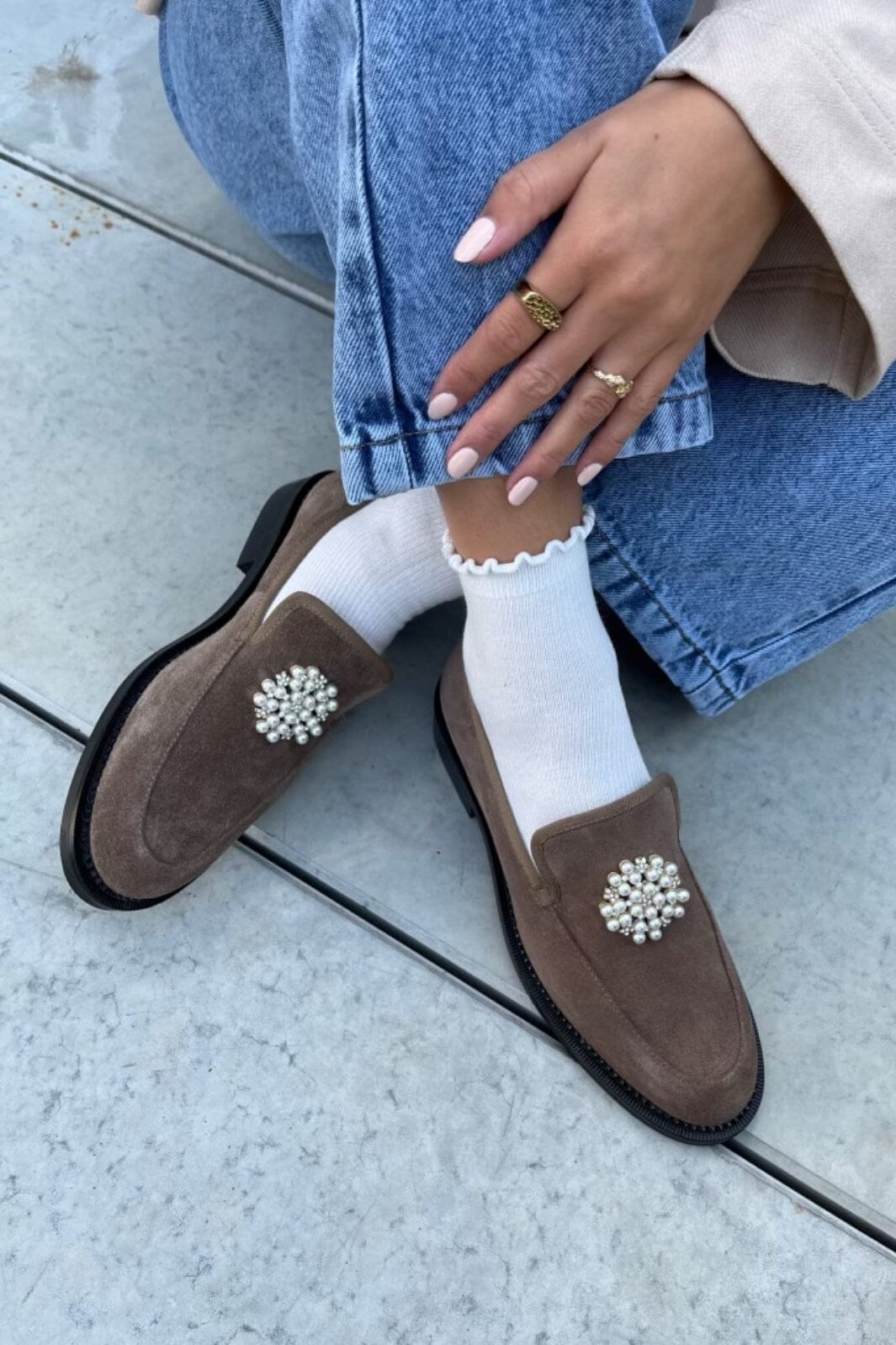 Brązowe loafersy z zamszu od Copenhagen Shoes. Mają perłowe detale z przodu i niski blokowy obcas, co sprawia, że są praktyczne zarówno na co dzień, jak i na imprezy.