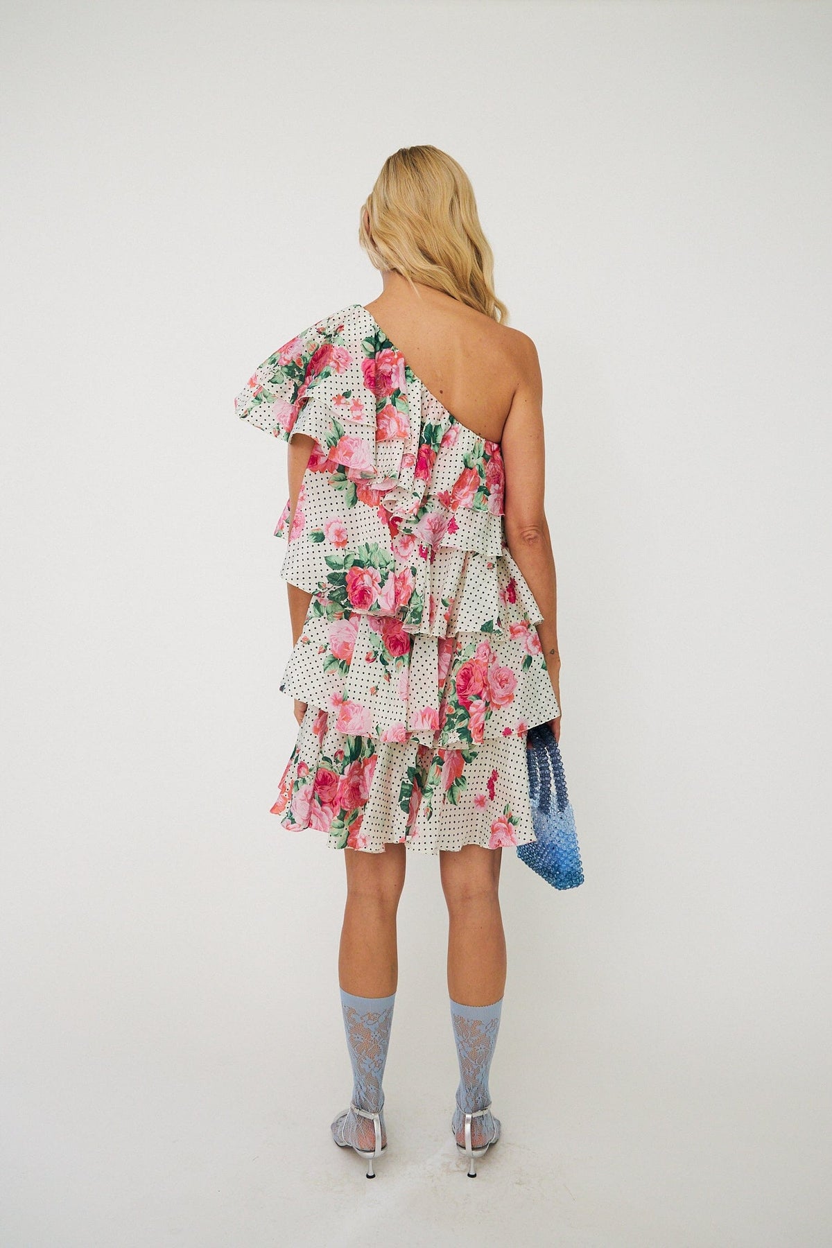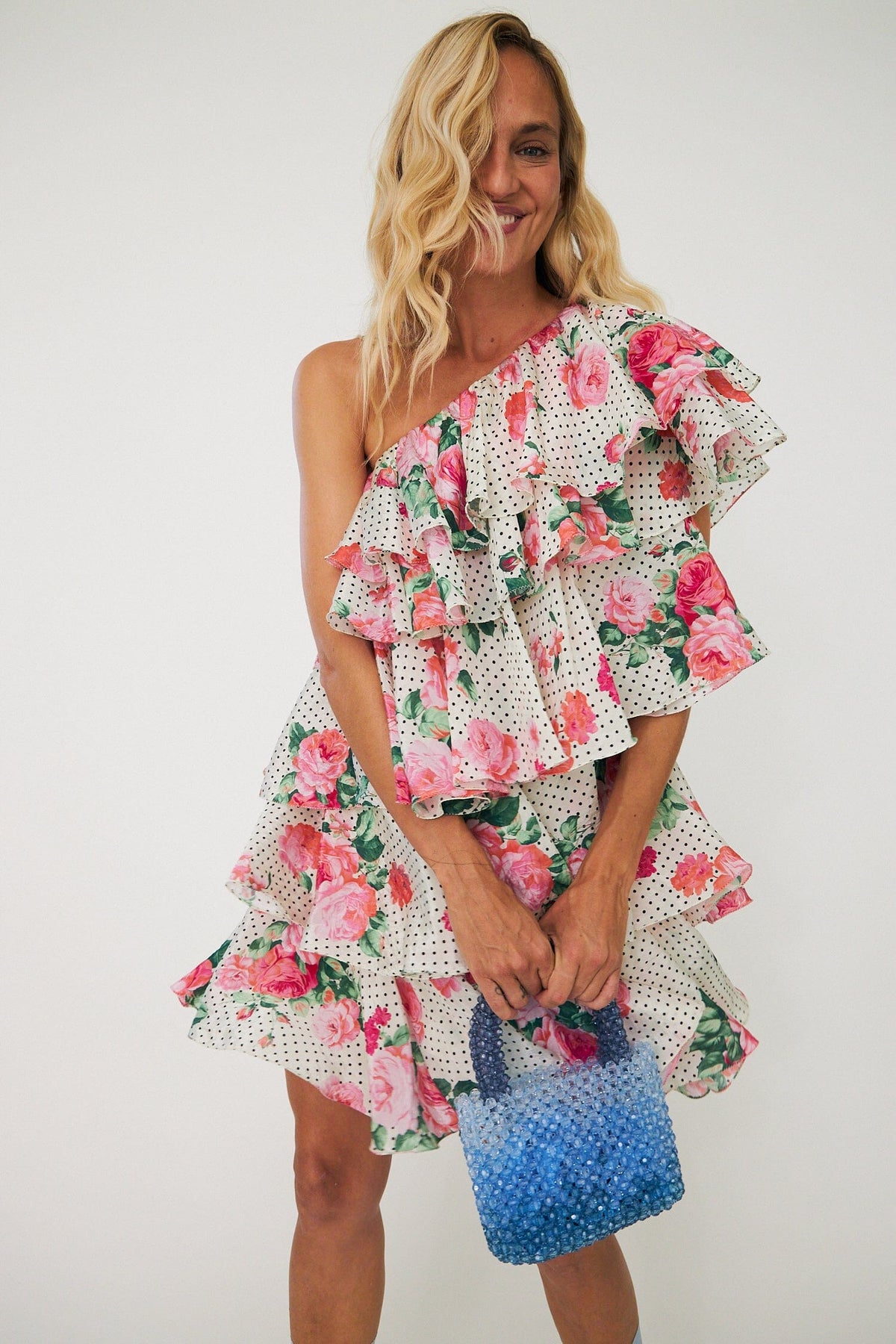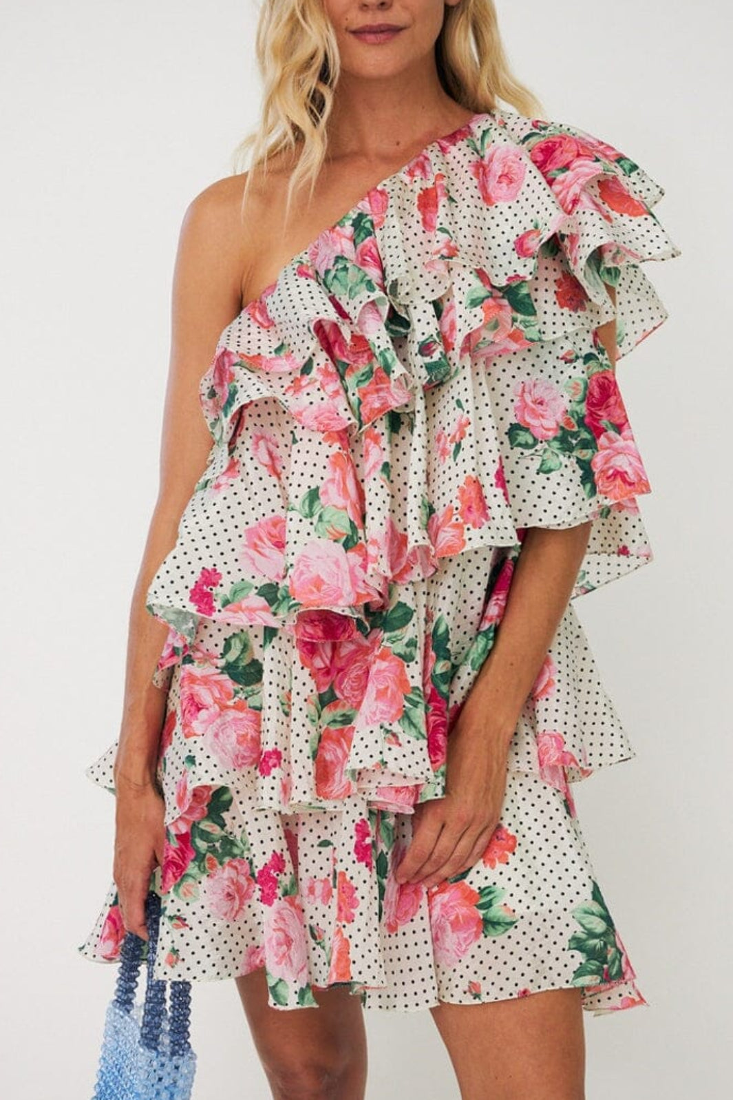 Sukienka off-shoulder od Cras z dużymi różami i małymi kropkami w kolorze Polka Rose na jasnym tle.