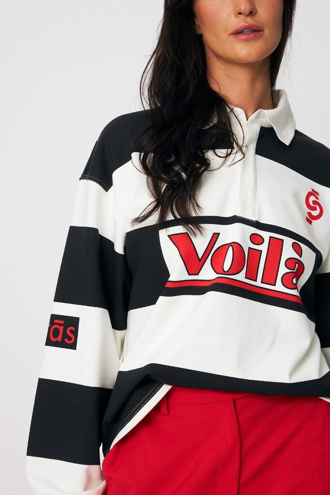 Czarna i kości słoniowej bluzka od Cras z paskami i graficznym nadrukiem Voilà w kolorze czerwonym. Bluzka ma luźny krój z kołnierzykiem polo i długimi rękawami.
