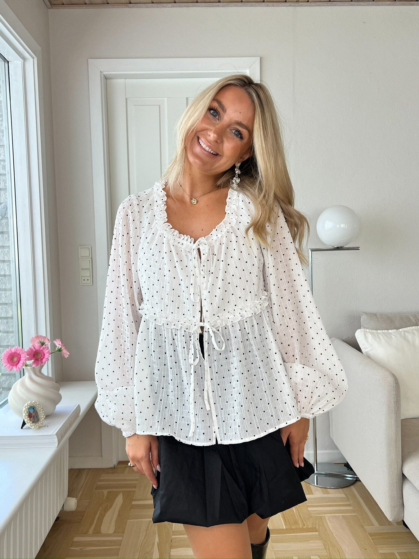 Biała bluzka w czarne kropki od Dear Molly. Bluzka ma długie rękawy oraz okrągły dekolt z falbankami.