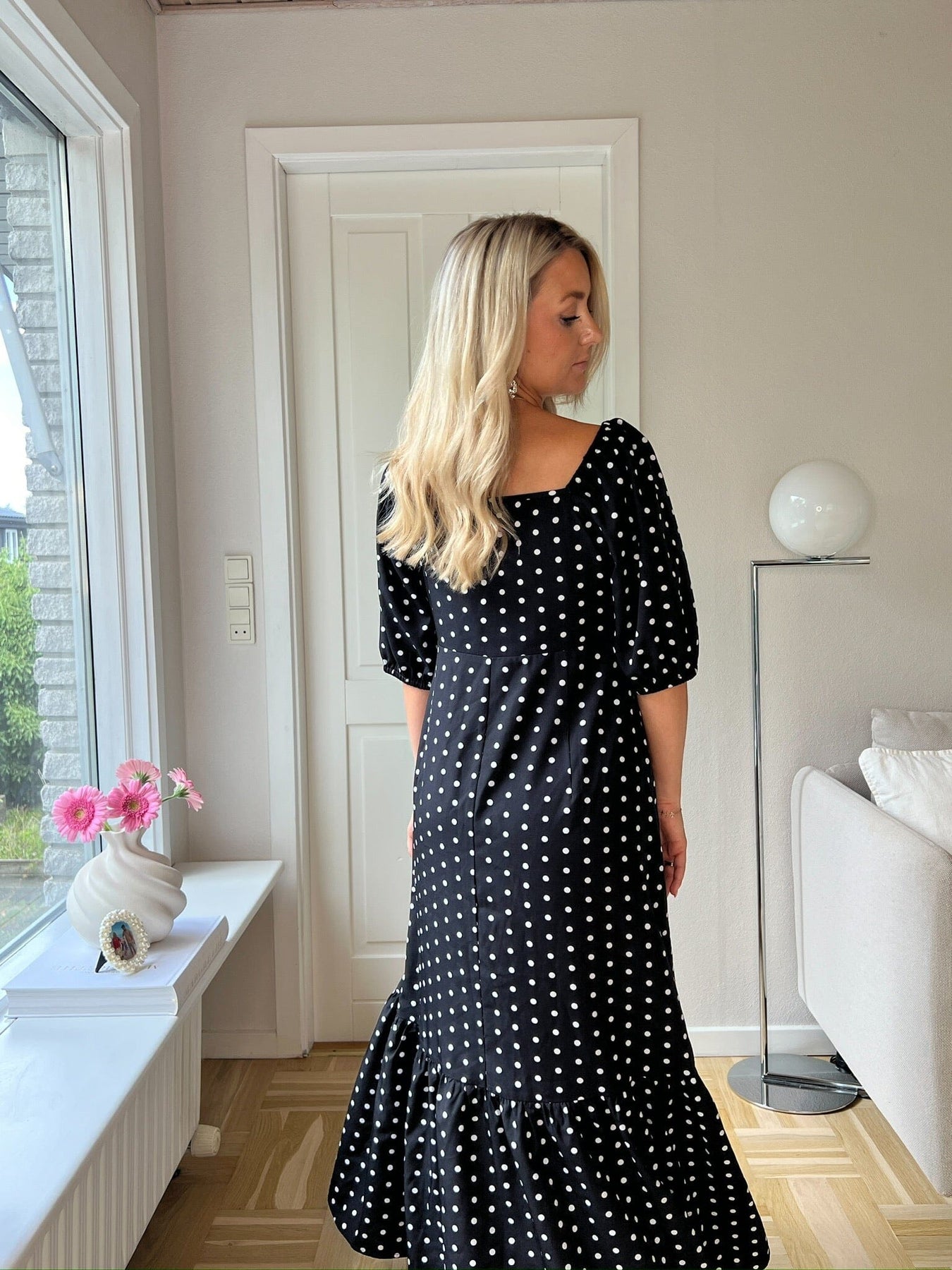 Czarna sukienka do kostek w białe kropki. Kwadratowy dekolt i rękawy 3/4 nadają sukience czysty i prosty wyraz. Falbanka na dole tworzy ruch w luźnym kroju.