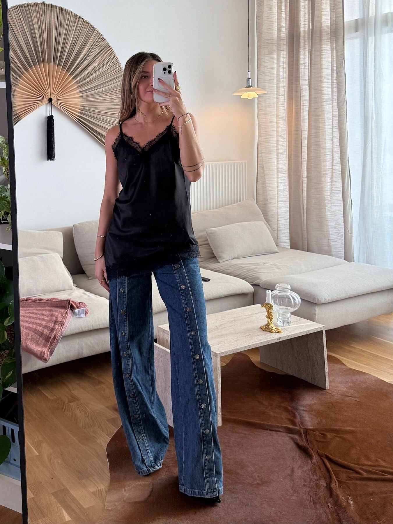 Czarny top Dear Molly z koronką wzdłuż dekoltu i dołu. Top ma cienkie ramiączka typu spaghetti i dekolt w kształcie litery V.