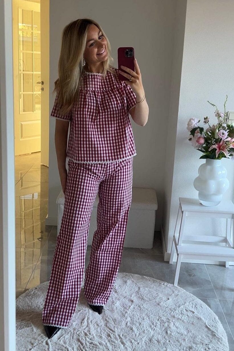 Spodnie Dear Molly, wykonane w 100% z bawełny w kolorach bordowym i białym. Materiał jest tkany i ma kraciasty wzór.