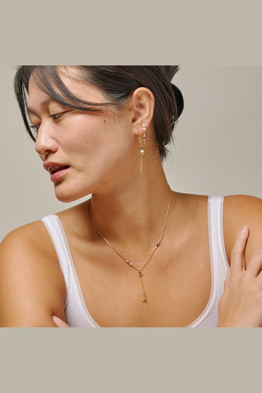Kolczyki Enamel Copenhagen, wykonane z pozłacanego 18-karatowym złotem srebra sterlingowego z recyklingu. Długie łańcuszki ozdobione są organicznymi elementami w kolorze złota, białymi perłami słodkowodnymi oraz zielonymi koralikami Miyuki.
