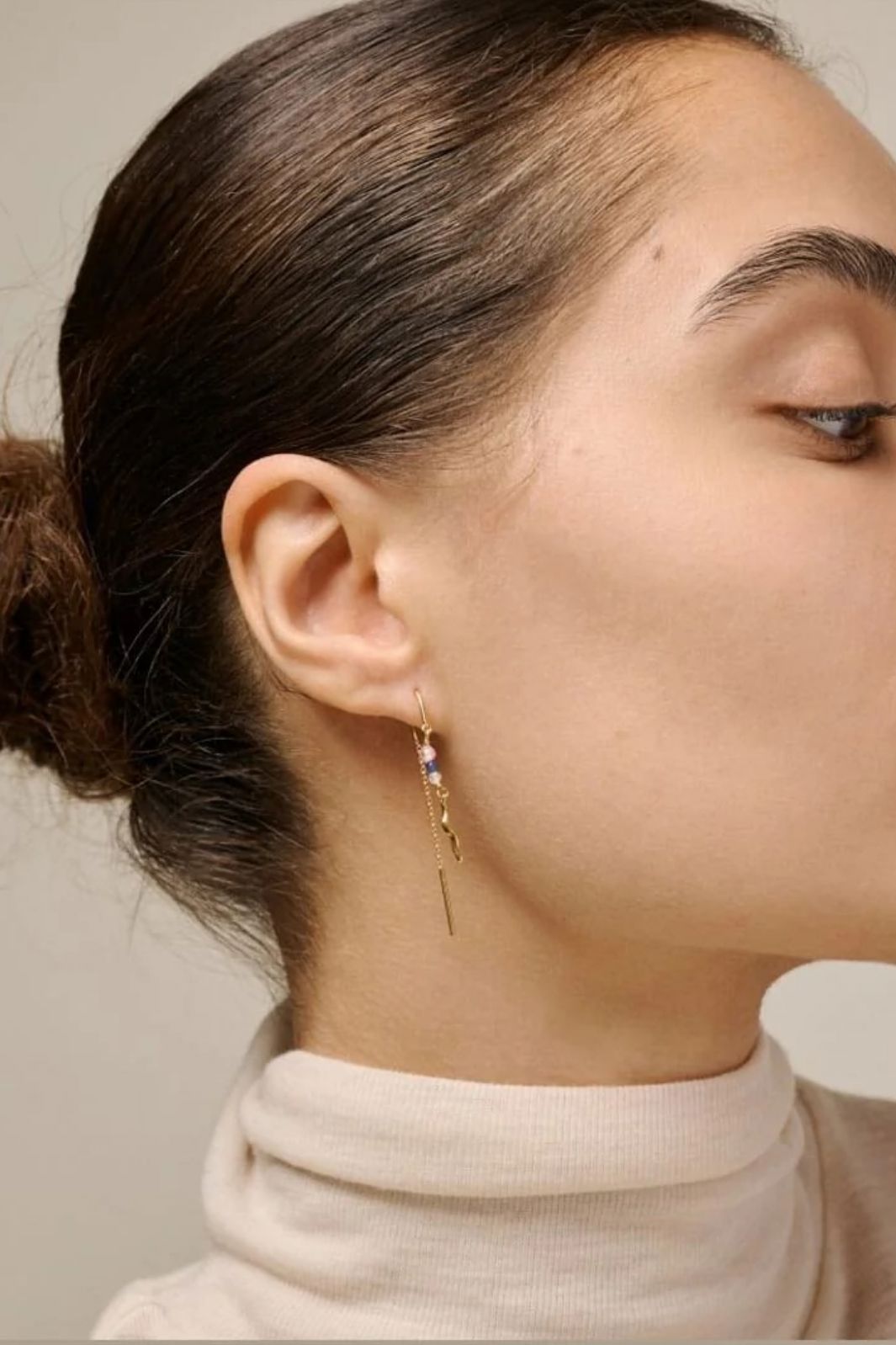 Kolczyki łańcuszkowe od Enamel Copenhagen z trzema kolorowymi perłami w różowym, niebieskim i białym kolorze. Kolczyki mają falisty koniec i są przekładane przez ucho.