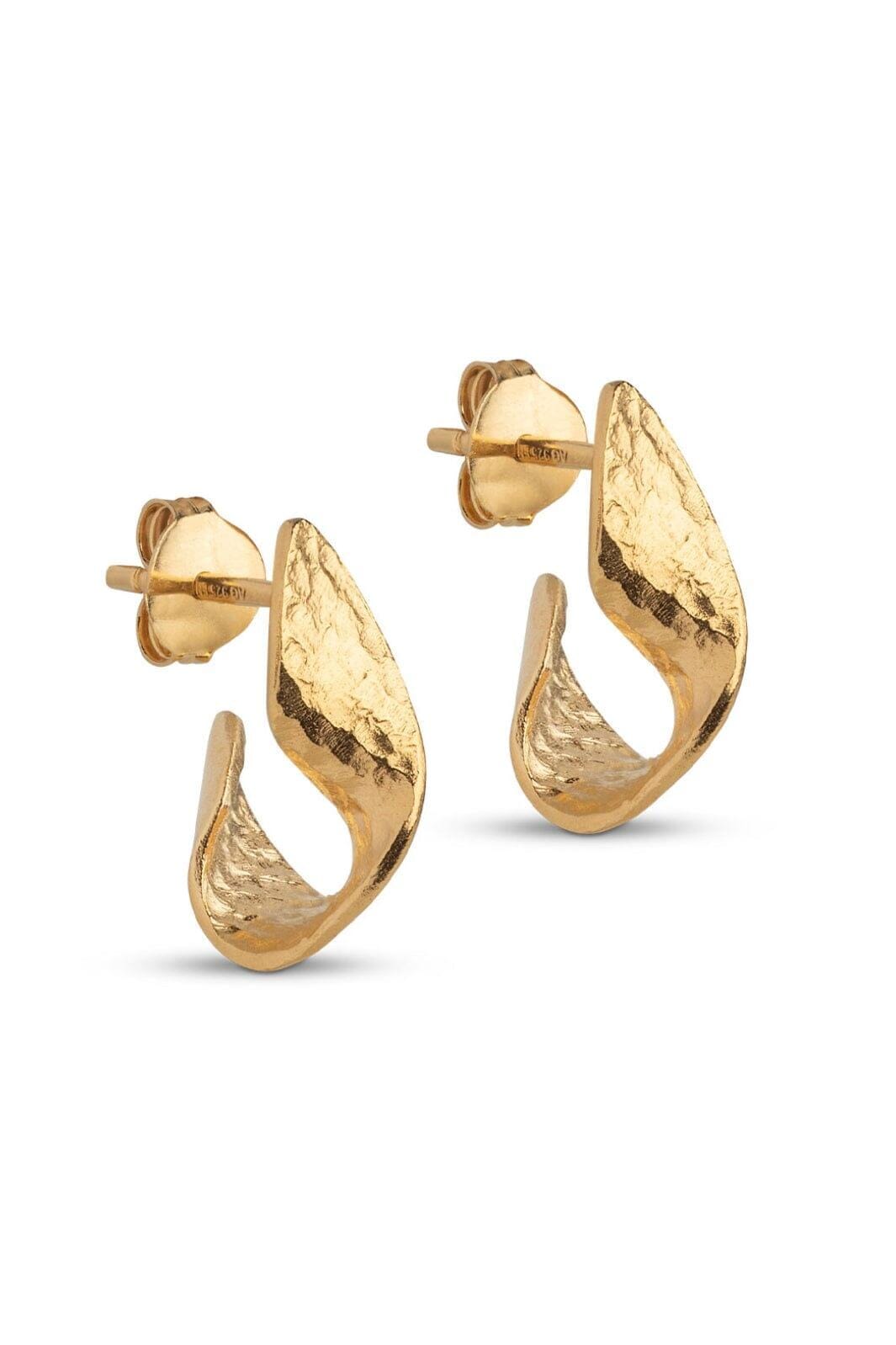 Złote kolczyki od Enamel Copenhagen o zakrzywionym i abstrakcyjnym kształcie. Kolczyki wykonane są z pozłacanego srebra sterlingowego o matowej powierzchni.