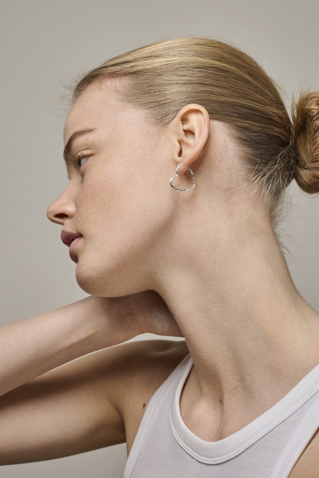 Kolczyki w kształcie serca od Enamel Copenhagen z wyjątkową, strukturalną powierzchnią. Ręcznie robione kolczyki są widoczne z boku i mają wyraźny kształt serca.
