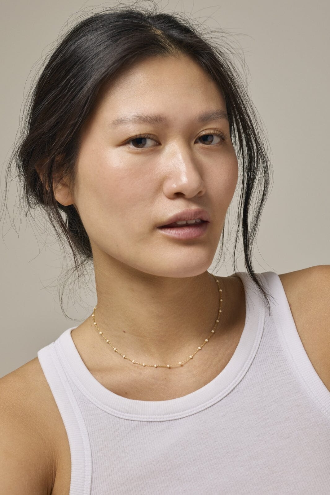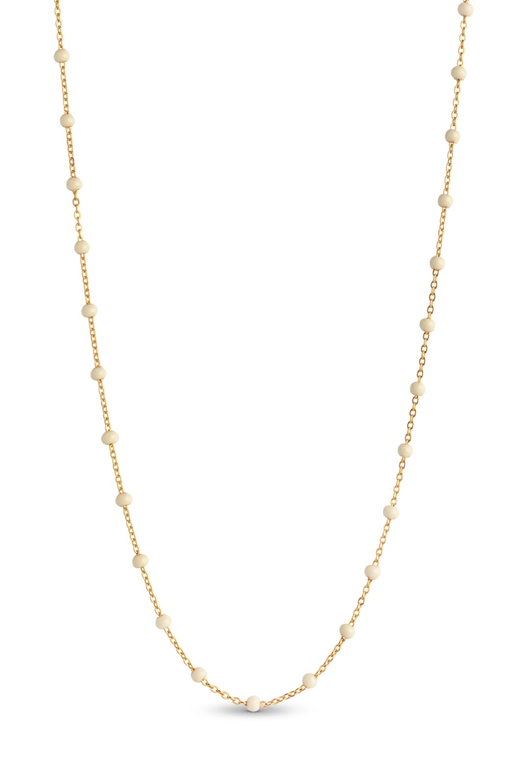 Naszyjnik pozłacany od Enamel Copenhagen z małymi okrągłymi perłami wzdłuż łańcuszka. Białe detale emaliowane w kolorze stokrotki tworzą piękny kontrast z złotą powierzchnią.