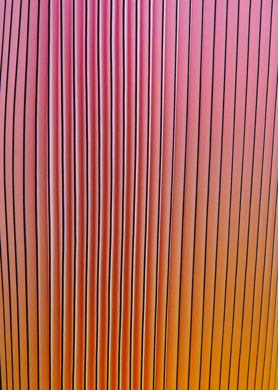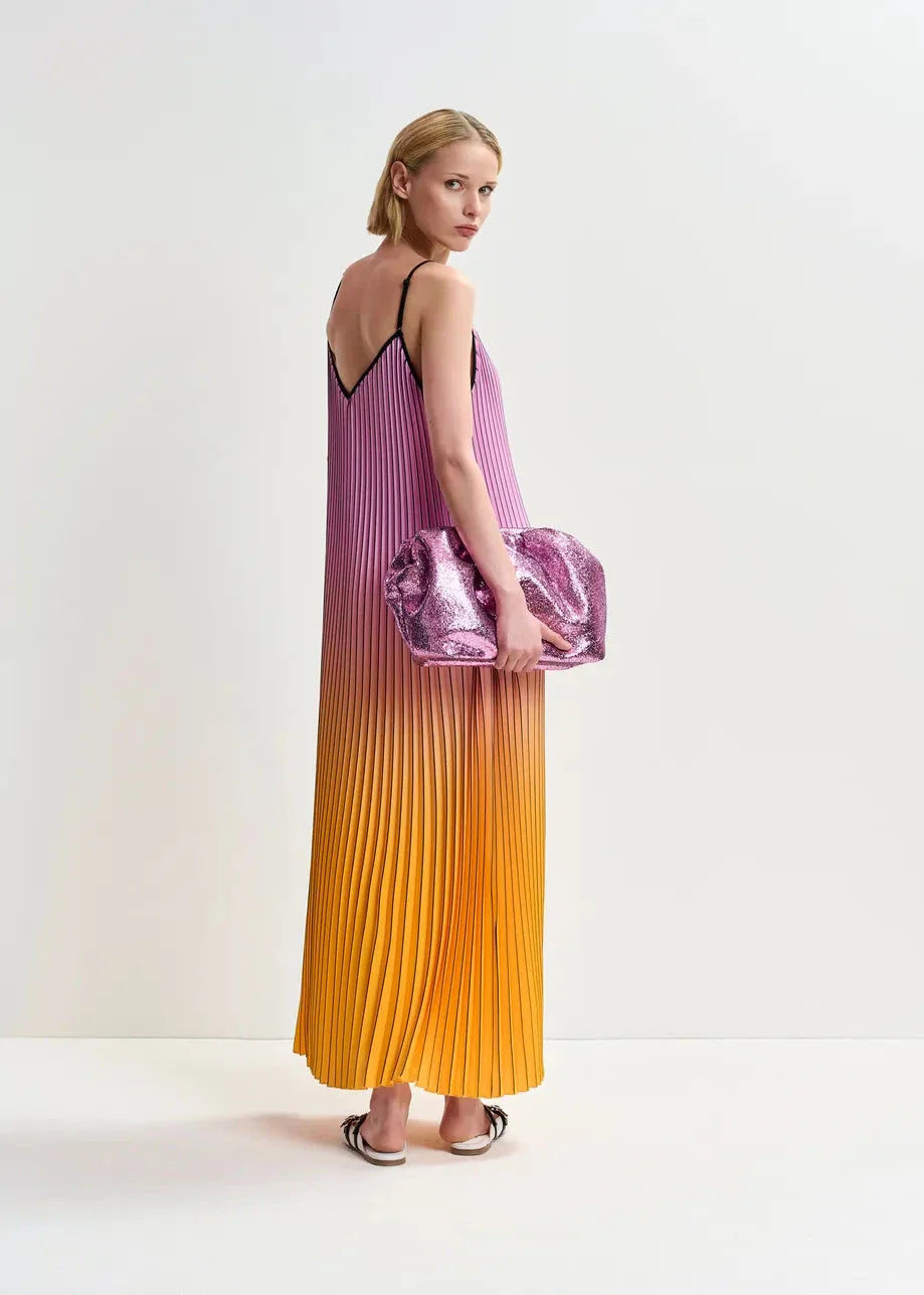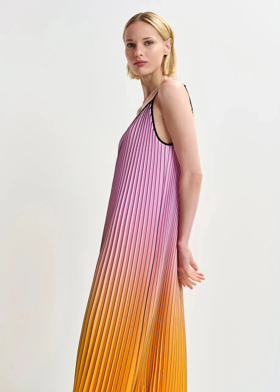 Długa sukienka od Essentiel Antwerp z plisami i przejściem kolorów od różowego do pomarańczowego i żółtego. Czarne ramiączka i dekolt w kształcie litery V stanowią ładny kontrast do kolorów.