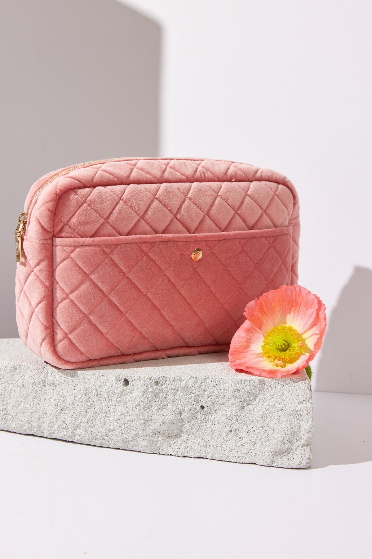 Kosmetyczka od Fan Palm z miękkiego weluru z pikowanym wykończeniem. Różowa torba ma zarówno dużą komorę główną, jak i praktyczną kieszeń na zewnątrz.